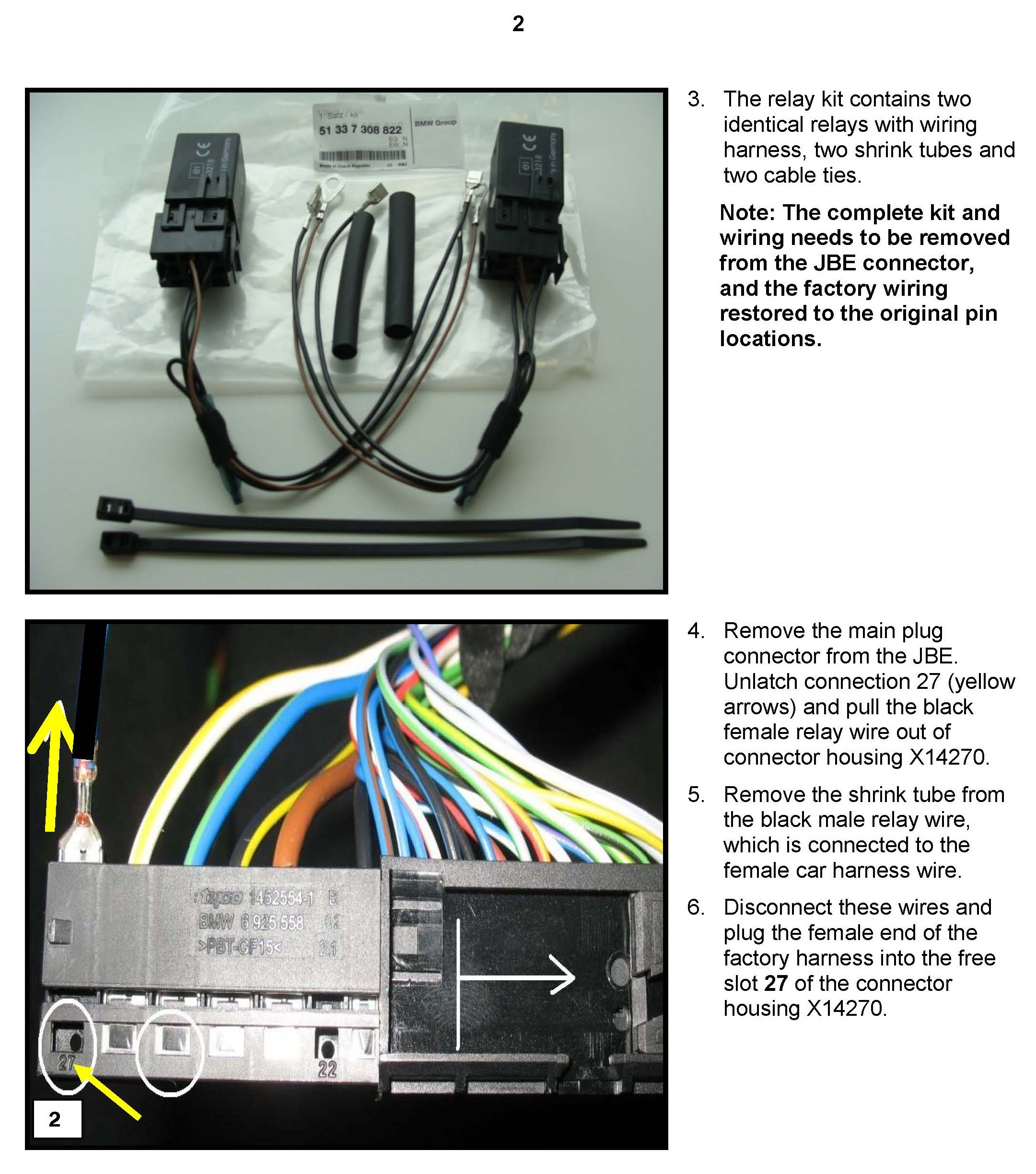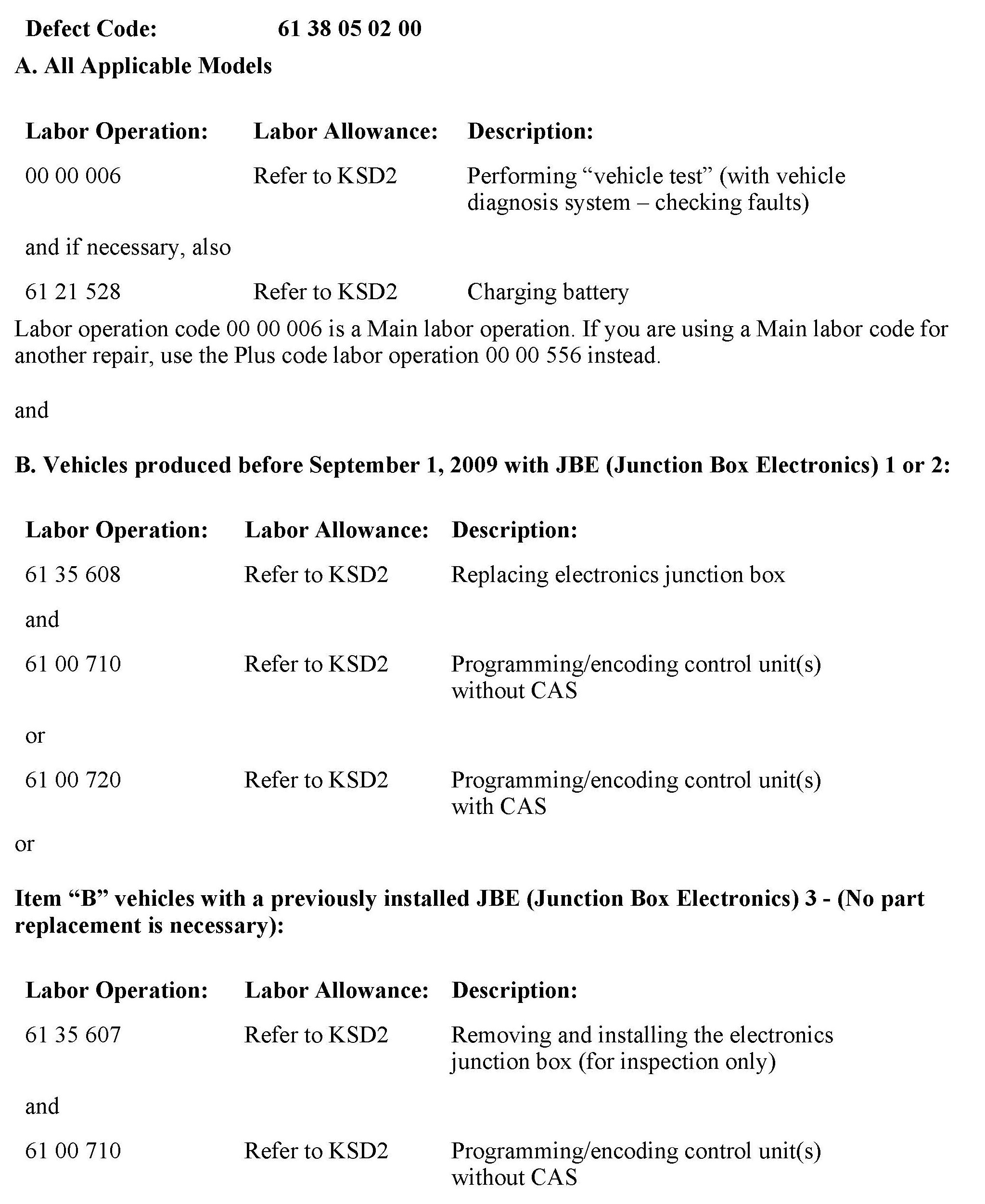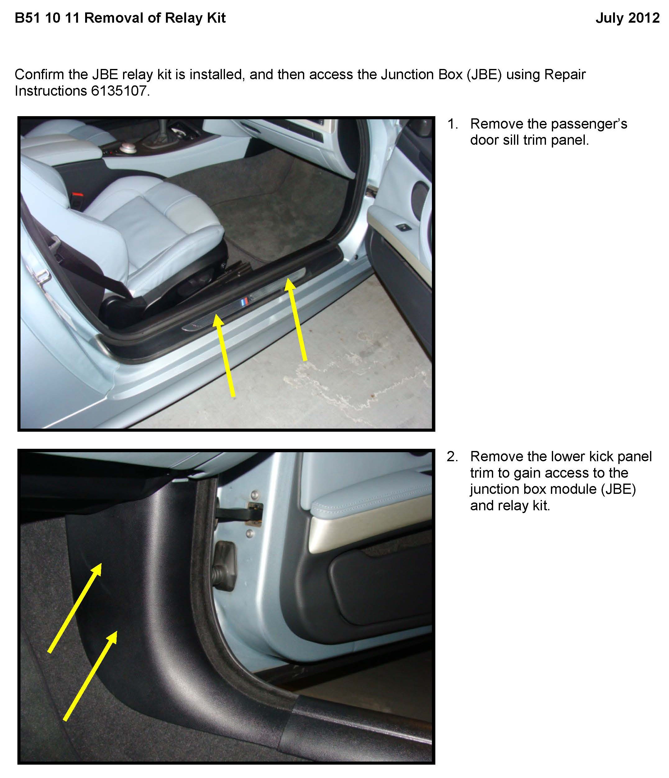 4. On all vehicles, a temporary solution was announced with the original version of this bulletin in May 2011. The solution was to install a relay conversion kit (51 33 7 308 822) to the JBE connector until the software solution was developed.