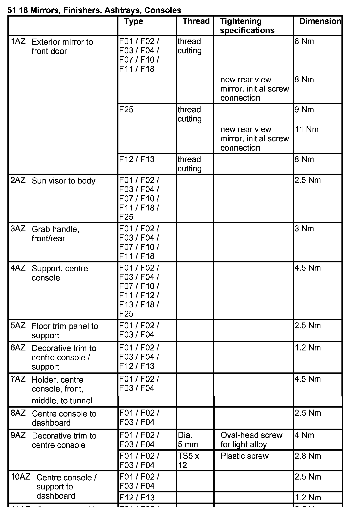 Tightening torque 51 16 7AZ.