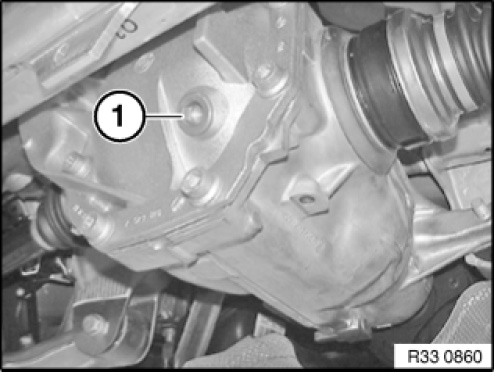 If necessary, pour in rear differential oil up to lower edge of opening for oil filler plug (1).