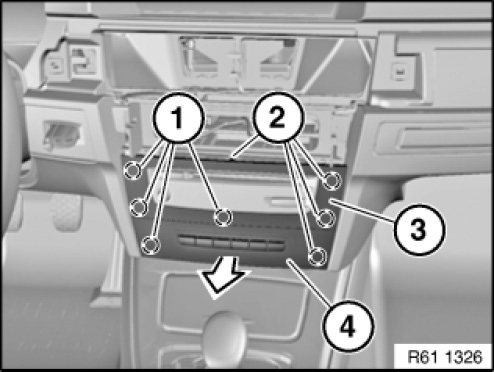 Unclip centre console control panel (1) at fastening points (2) and (4) and remove.