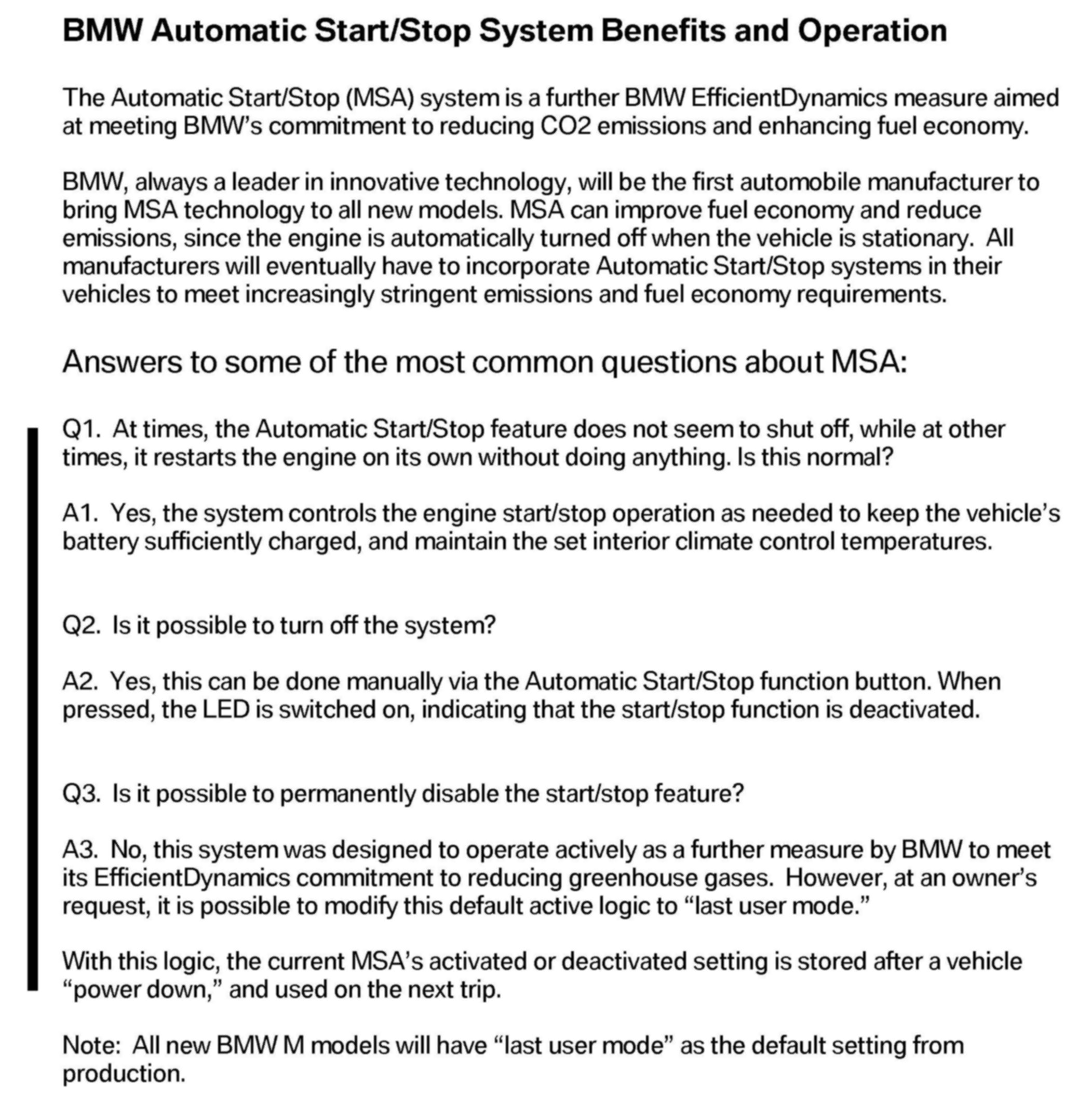 The Automatic Start/Stop (MSA) system is a further BMW Efficient Dynamics measure aimed at meeting BMWs commitment to reducing CO2 emissions and enhancing fuel economy.