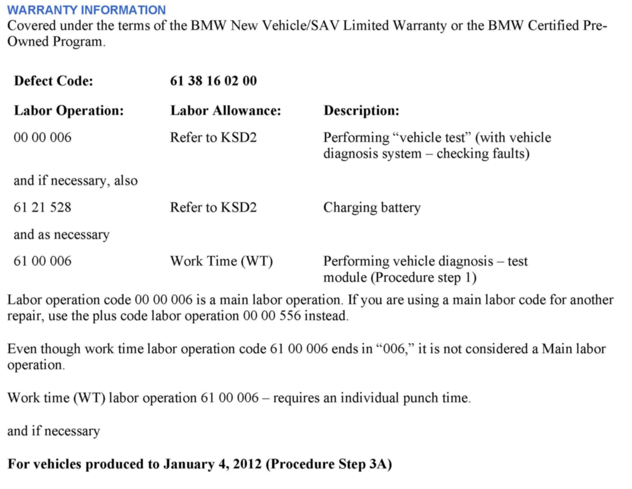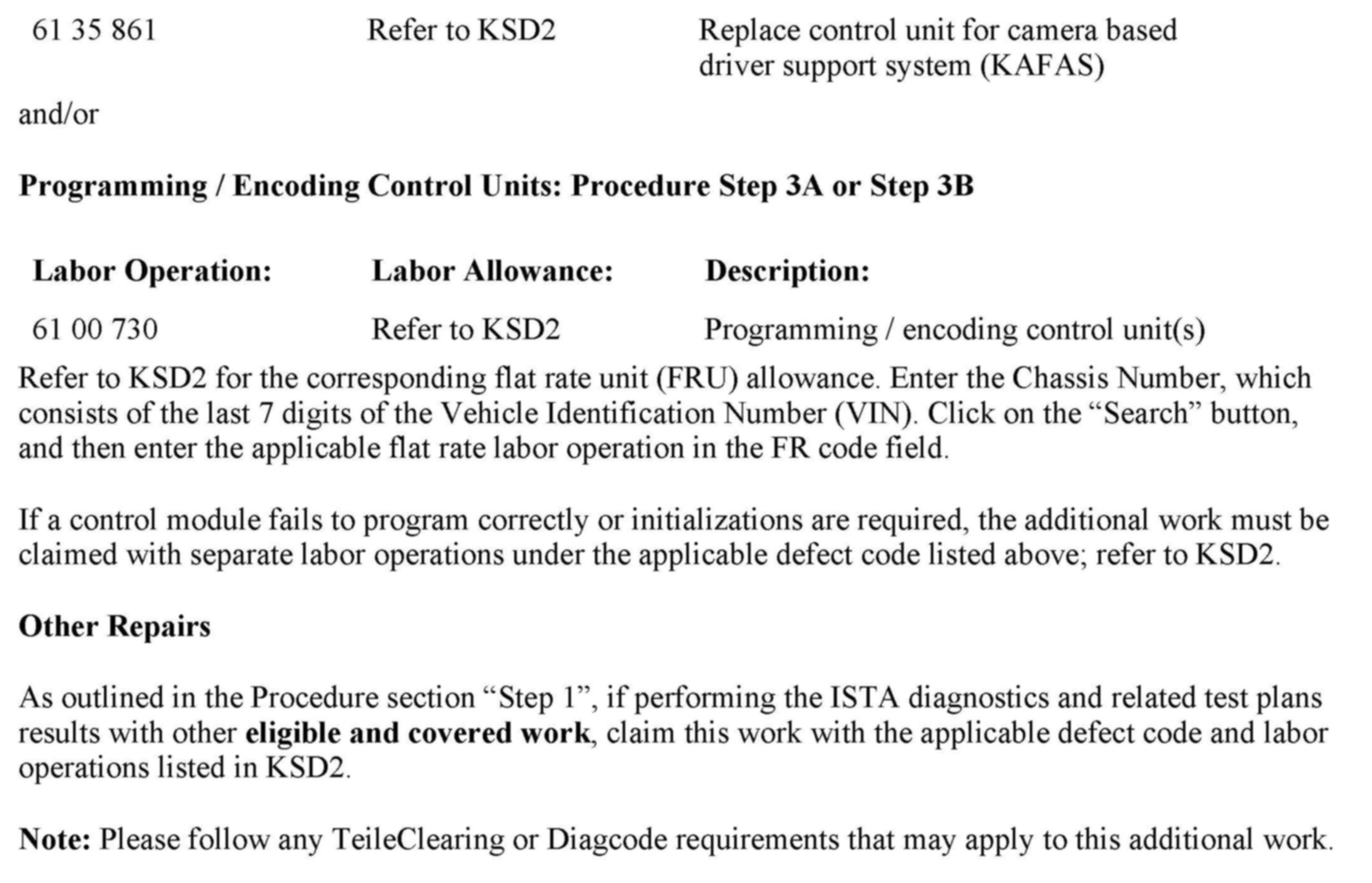 a. For vehicles produced to January 4, 2012, the KAFAS control unit must be replaced and the vehicle programmed and coded with ISTA/P 2.47.5 or higher.