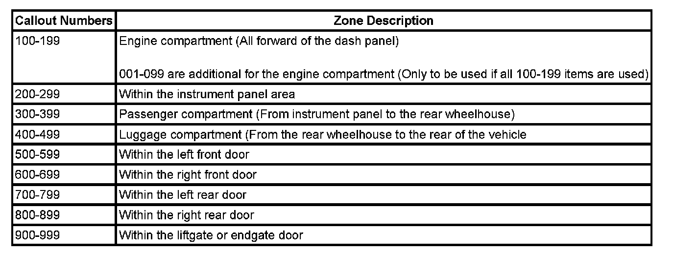 All grounds, in-line connectors, pass-through grommets, and splices have identifying numbers that correspond to where they are located in the vehicle. The table explains the numbering system.