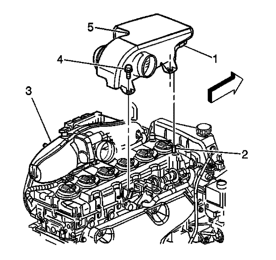 3. Install the 2 resonator to engine bolts (4) to the air cleaner outlet resonator (5). Tighten the bolts to 6 Nm (63 lb in).