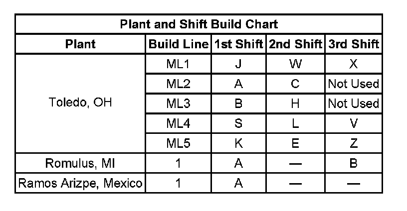 12 - Build Location Y = Toledo, OH, R = Romulus, MI, 4 = Ramos Arizpe, Mexico