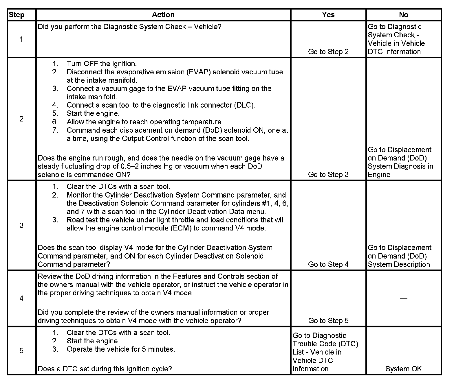 3. Perform a road test while monitoring the cylinder deactivation data parameters with a scan tool. If the engine does not switch to a V4 mode, then review the inhibit reasons listed in the DoD system description.