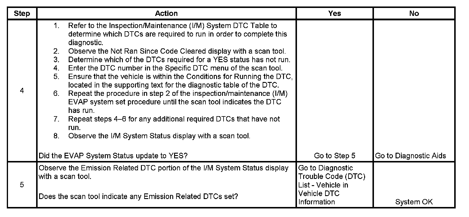 The purpose of this procedure is to satisfy the enable criteria necessary to execute inspection/maintenance (I/M) readiness diagnostics for the Evaporative Emission (EVAP) System. The procedure may be used to set the EVAP I/M System Status display on the scan tool to YES. The EVAP I/M System Status display indicates whether or not the control module has completed the readiness diagnostics. The readiness diagnostics are complete when all DTCs comprising the diagnostics run and pass, or any DTC comprising the diagnostics illuminates the malfunction indicator lamp (MIL). If the diagnostics pass during one drive cycle, 17 hours must elapse, regardless of whether the vehicle is driven or not. Then, the diagnostics will run again during the next drive cycle in which the conditions for running are met. Once the diagnostics have passed during the third drive cycle, the EVAP I/M System Status display will be updated to YES. A failed or aborted diagnostic will require the vehicle to cool down in order to meet the enable criteria for another drive cycle. Therefore, performing a visual inspection prior to running the EVAP test may prevent having to repeat the drive cycle.