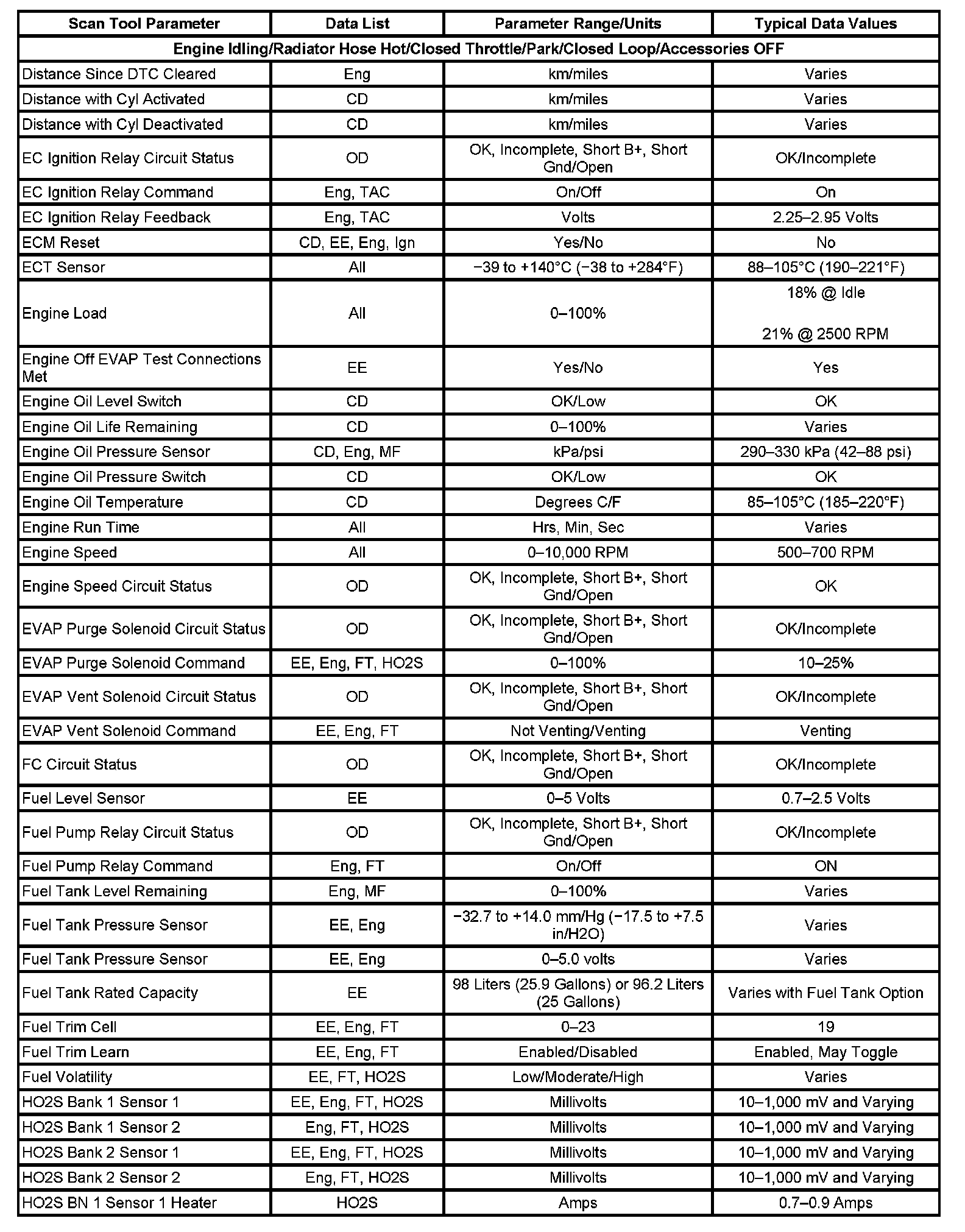 The Engine Scan Tool Data List contains all engine related parameters that are available on the scan tool. The list is arranged in alphabetical order. A given parameter may appear in any one of the data lists, and in some cases may appear more than once, or in more than one data list in order to group certain related parameters together.