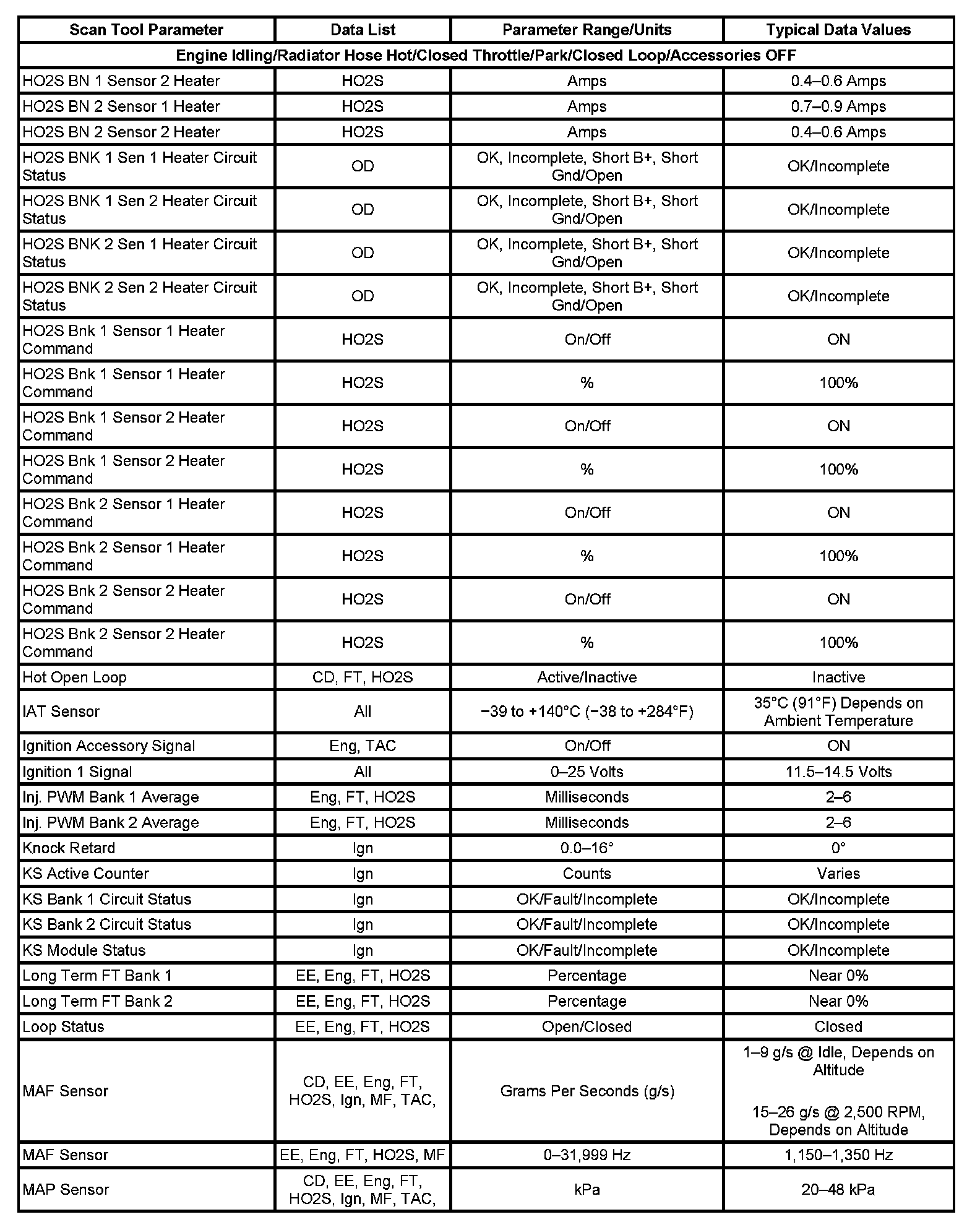 Scan tool values from a properly running engine may be used for comparison with the engine you are diagnosing. The Engine Scan Tool Data List represents values that would be seen on a normal running engine at idle.
