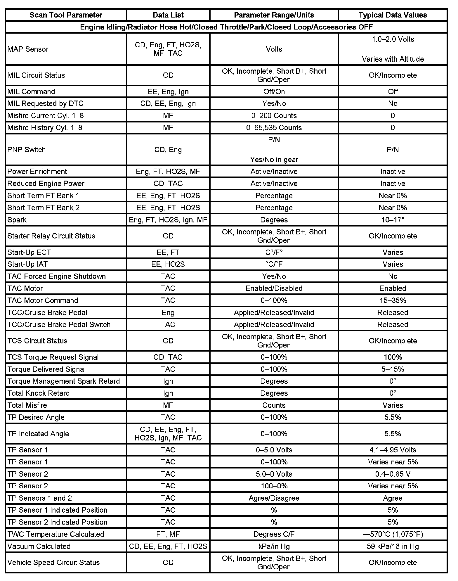Only the parameters listed below are referenced in this Service Data for use in diagnosis. If all values are within the typical range described below, refer to Symptoms - Computers and Control Systems for diagnosis. Symptom Related Diagnostic Procedures