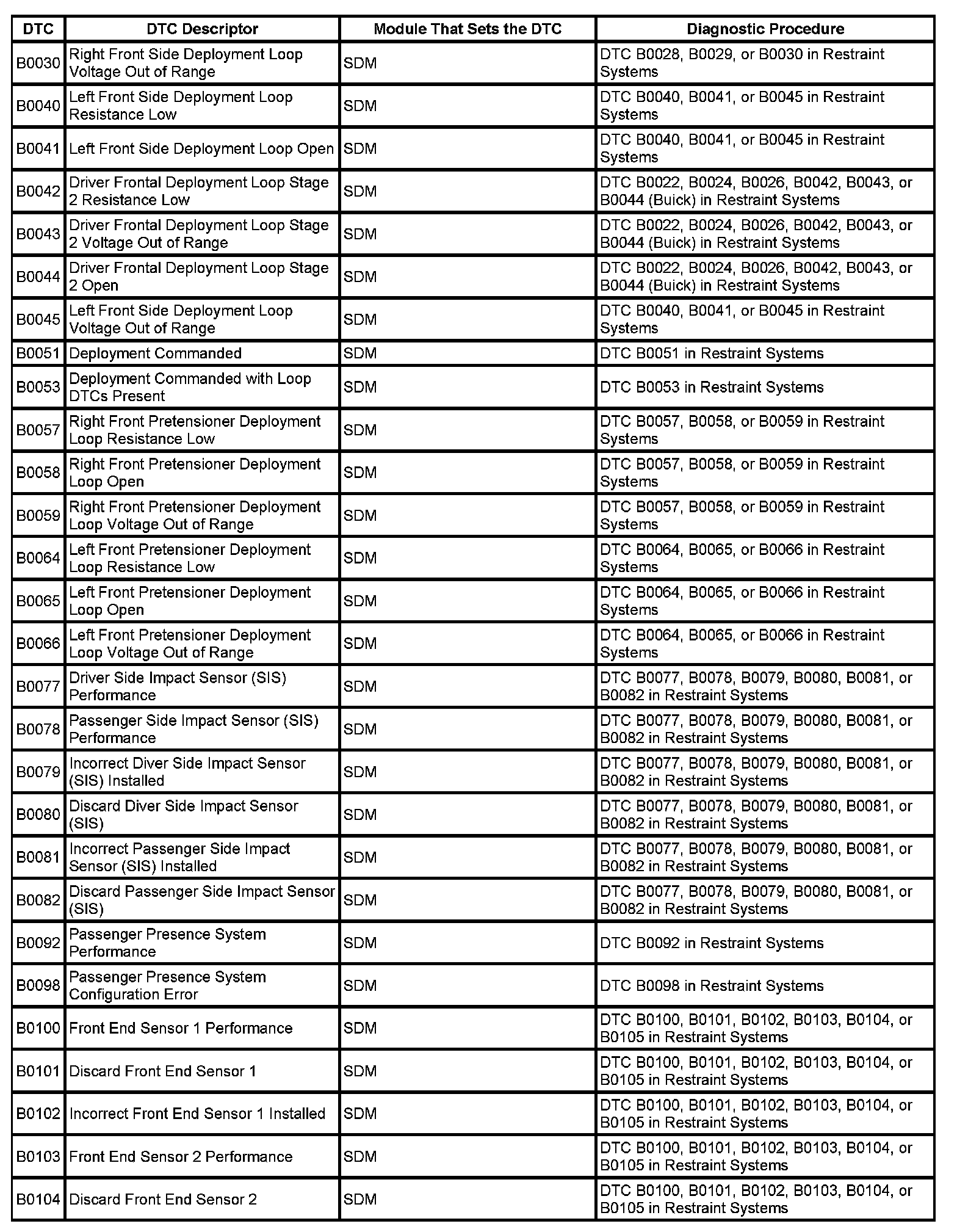 DTC's B0030 - B0104:
