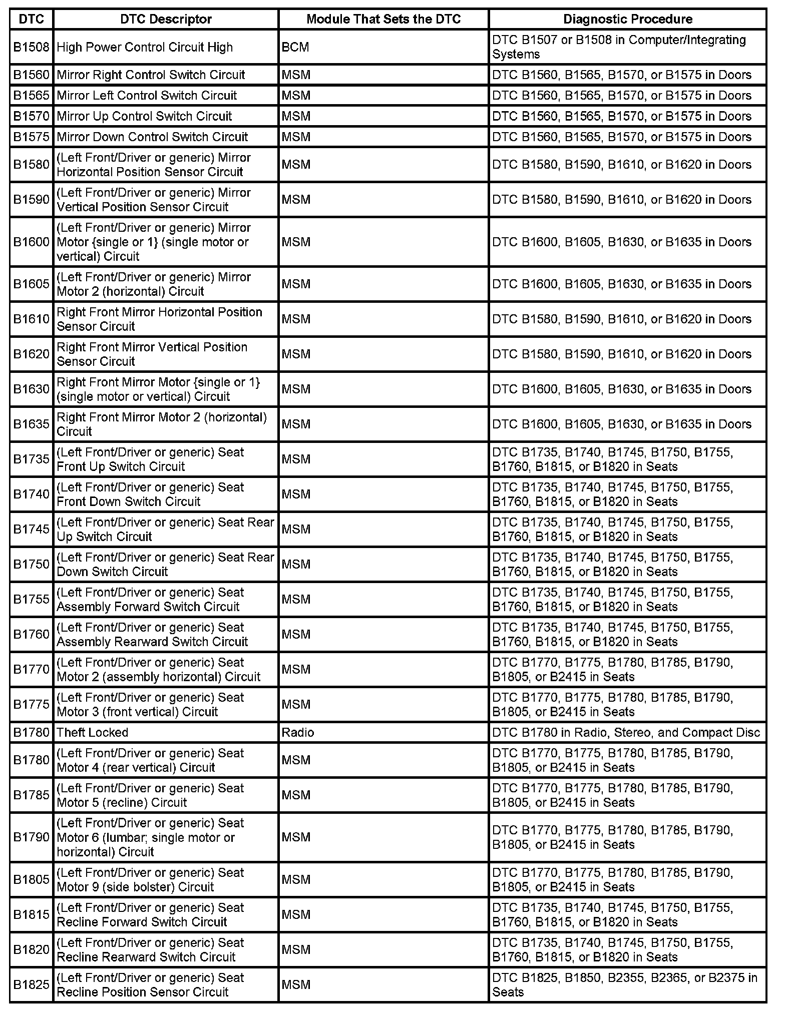 DTC's B1508 - B1825: