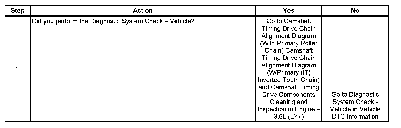 The engine control module (ECM) tests for a mis-alignment between both camshafts on one bank of the engine and the crankshaft. The mis-alignment would be at an idler sprocket for bank 1 or at the crankshaft. Once the ECM learns the position of both camshafts on one bank of the engine, the ECM compares the learned values to a reference value. If the ECM detects both learned values for one bank of the engine is exceeding a calibrated threshold in the same direction, this DTC sets.