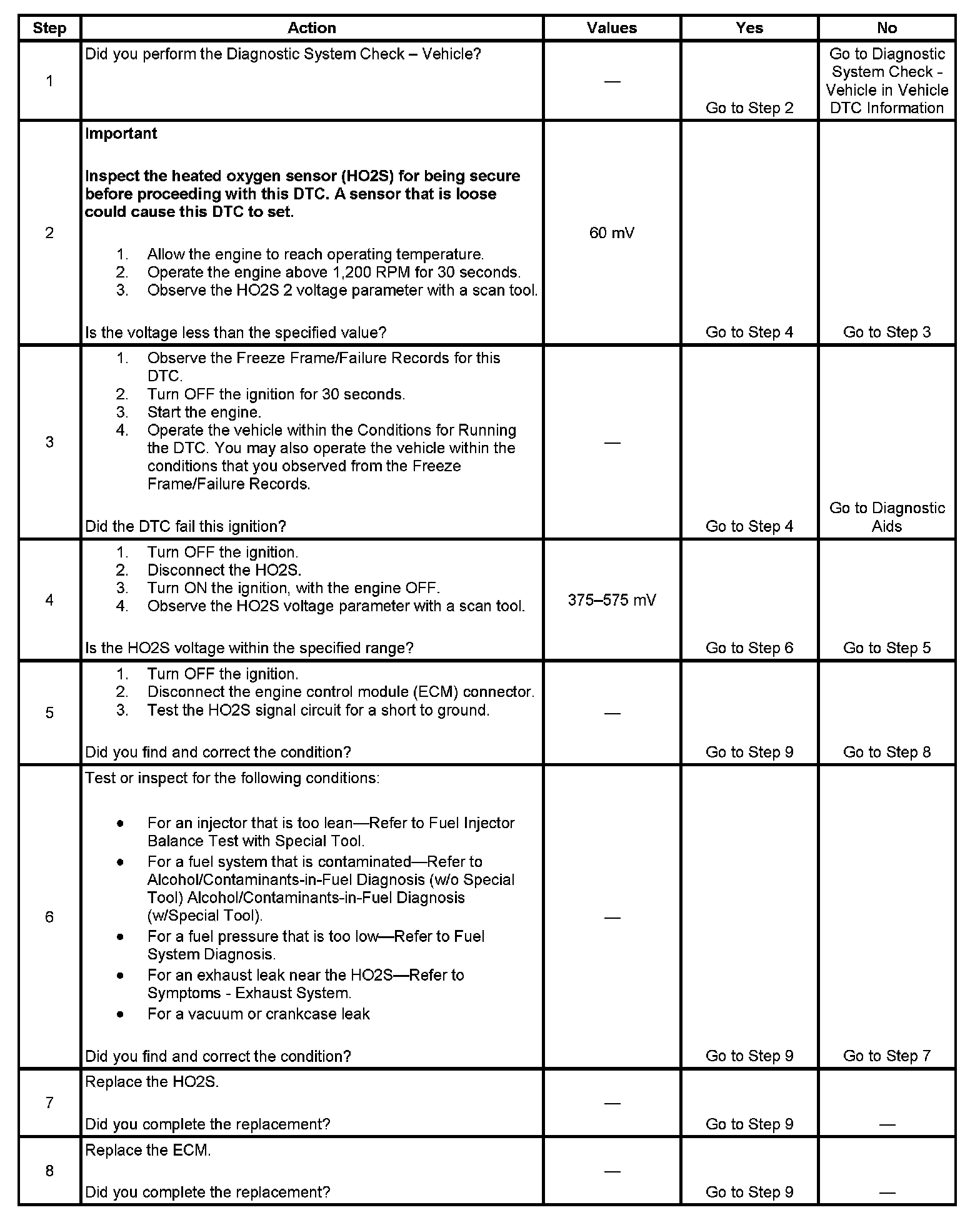 The engine control module (ECM) supplies a voltage near 450 mV between the heated oxygen sensor (HO2S) high signal circuit and the low reference circuit. The HO2S varies the voltage over a range from about 1,000 mV when the exhaust is rich, down through about 10 mV when the exhaust is lean.