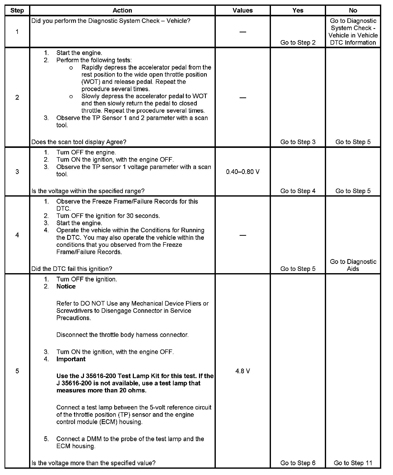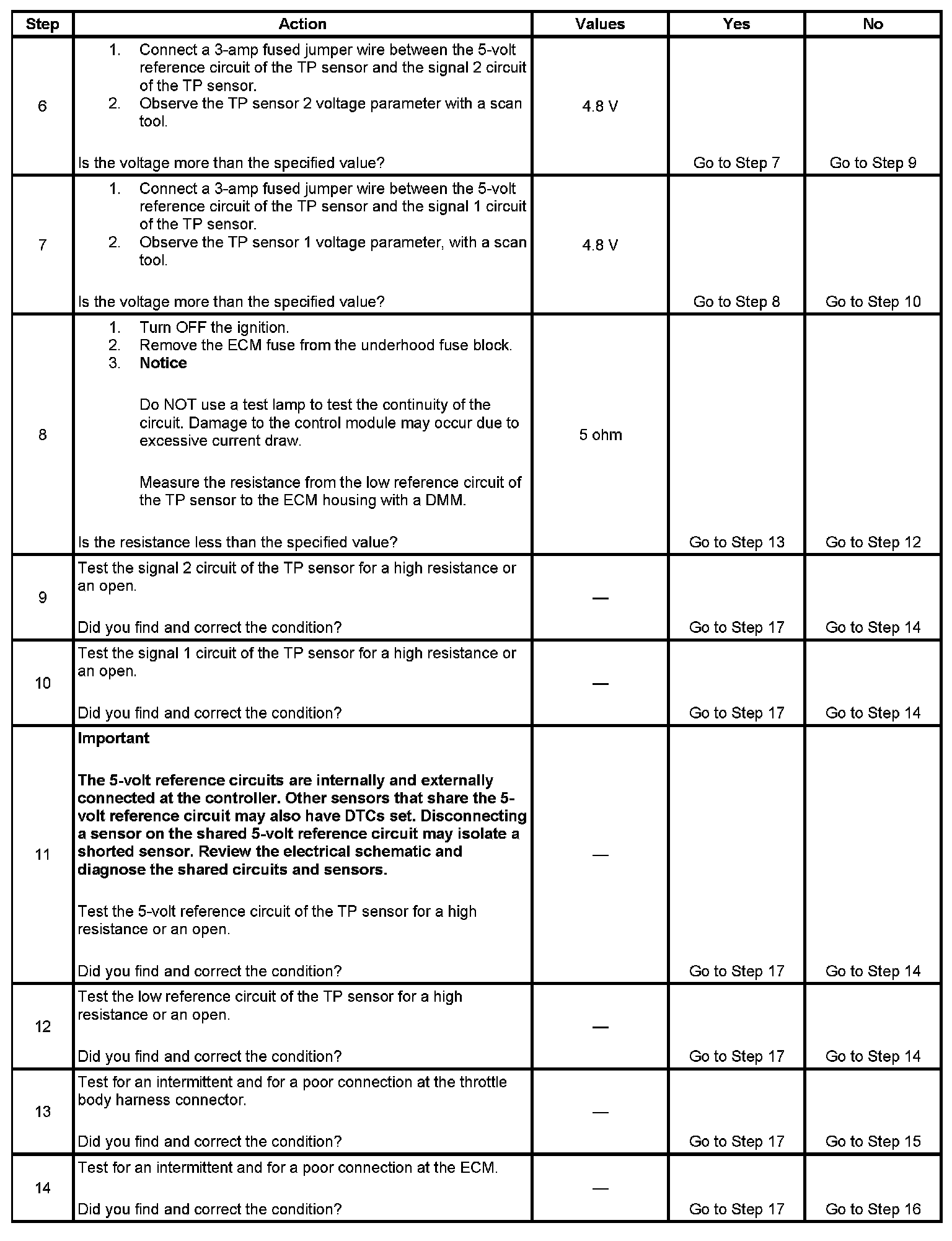 5. This step tests for high resistance in the 5-volt reference circuit of the TP sensors. If the DMM does not display more than the specified voltage there is high resistance in the circuit.