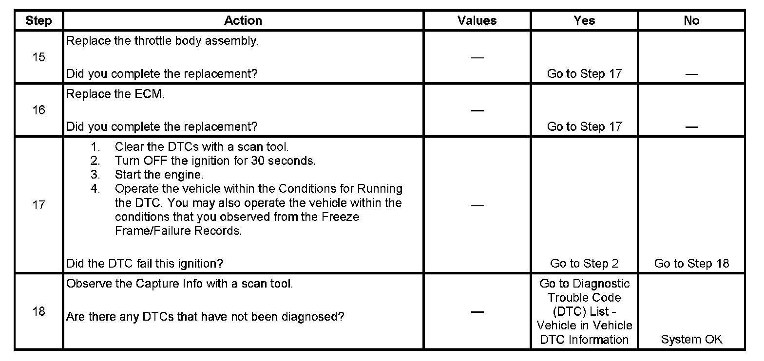 The ECM compares the signal of the TP sensor 1 and TP sensor 2 through the entire range. If the ECM detects a predetermined difference between sensor 1 and sensor 2, or a predetermined difference from the predicted range, this DTC sets.