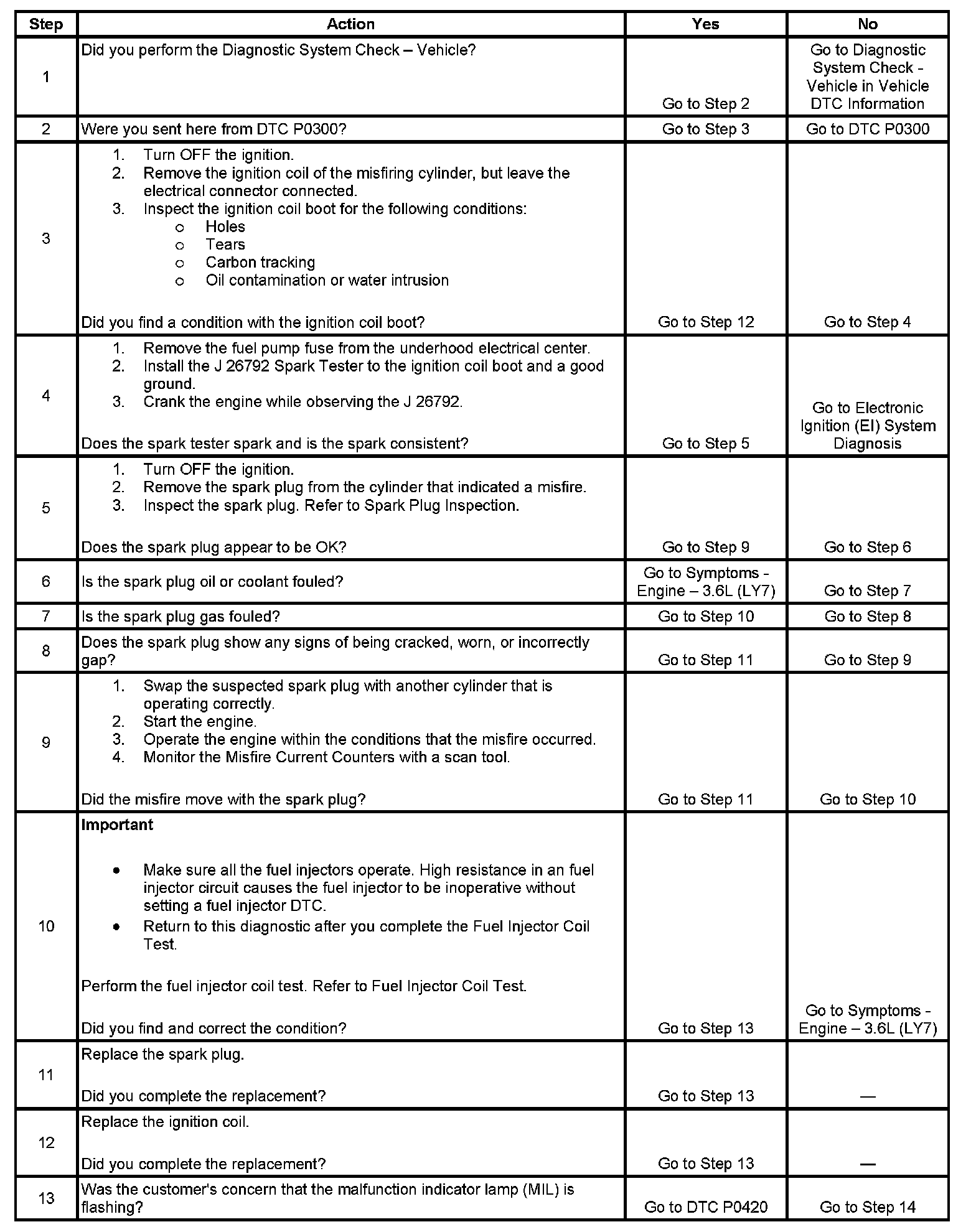 The engine control module (ECM) uses information from the crankshaft position (CKP) sensor and the camshaft position (CMP) sensors in order to determine when an engine misfire is occurring. By monitoring variations in the crankshaft rotation speed for each cylinder, the ECM is able to detect individual misfire events. A misfire rate that is high enough can cause 3-way catalytic converter (TWC) damage. The malfunction indicator lamp (MIL) will flash ON and OFF when the conditions for catalytic converter damage are preset. DTCs P0301-P0306 correspond to cylinders 1-6. If the ECM is able to determine that a specific cylinder is misfiring, the DTC for that cylinder sets.