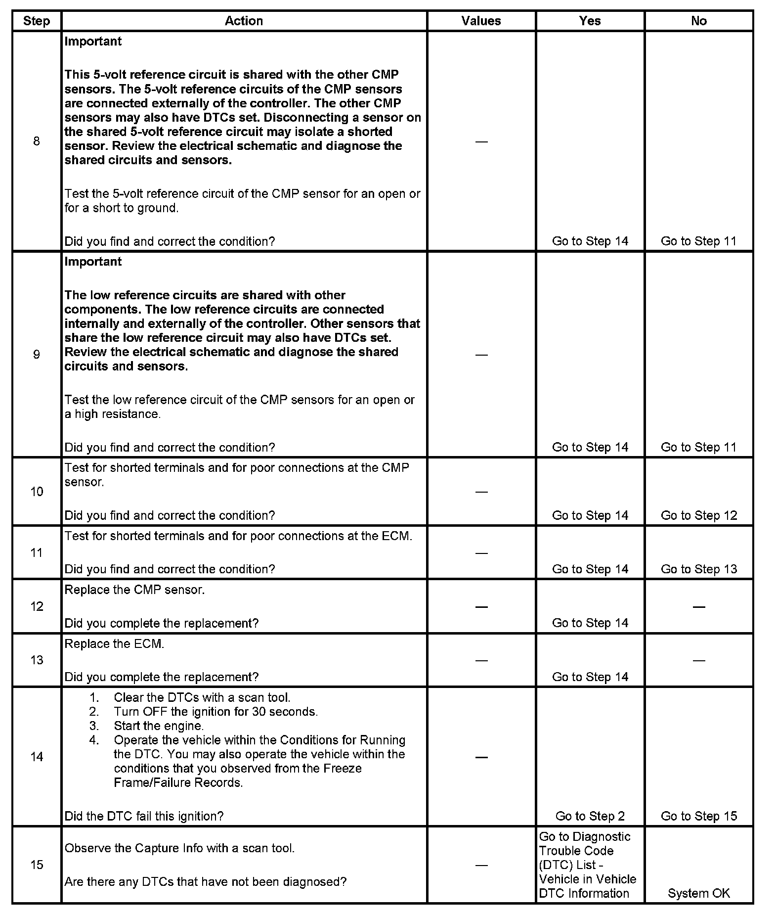 The ECM supplies 5 volts to the CMP sensors on the 5-volt reference circuits, and supplies a ground on the low reference circuits. The CMP sensors provide a signal to the ECM on the signal circuits. If the ECM detects the CMP signal voltage is more than a predetermined voltage, within a certain number of crankshaft revolutions, this DTC sets.