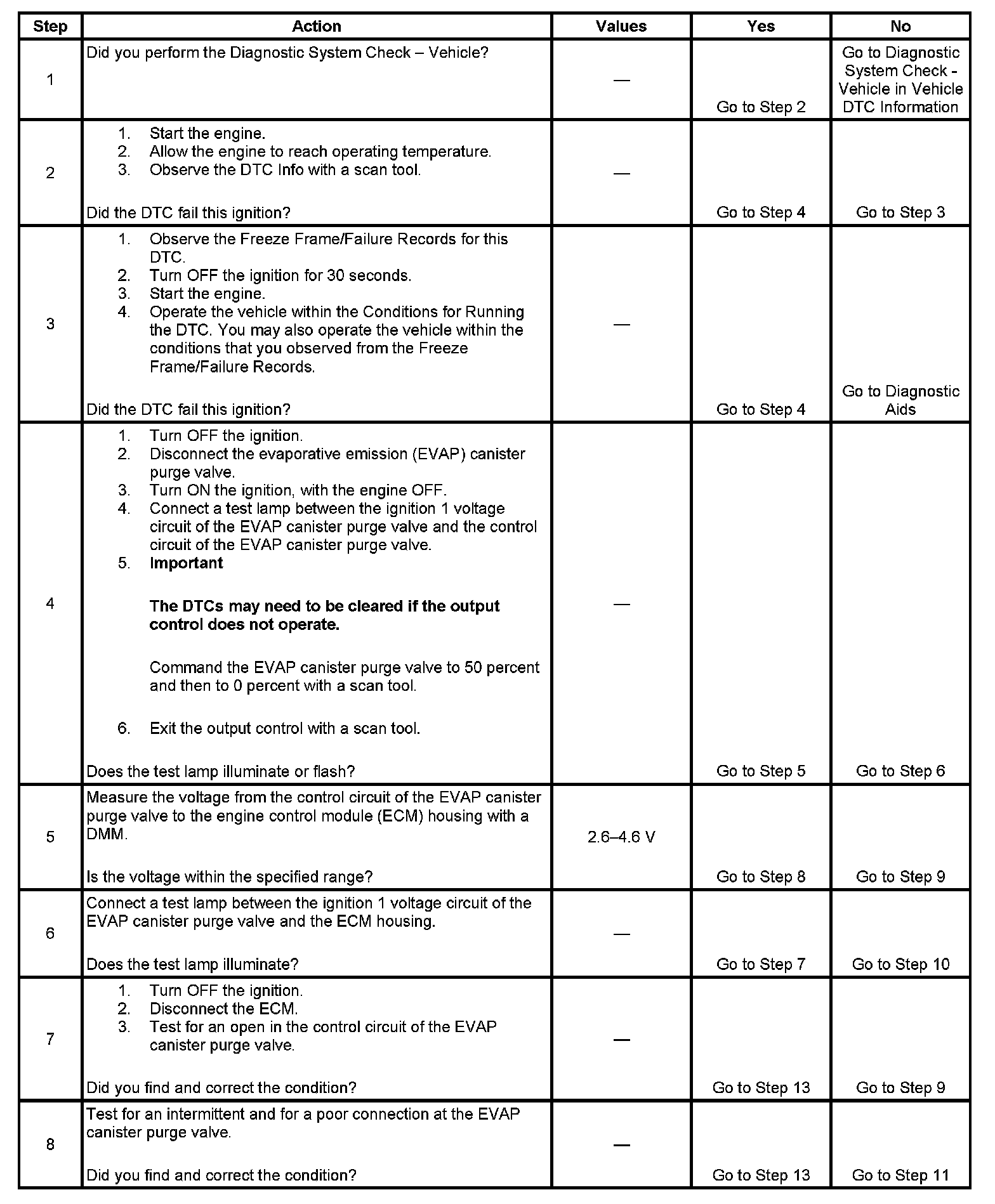 The evaporative emission (EVAP) canister purge valve is used to purge fuel vapor from the EVAP canister to the intake manifold. The EVAP canister purge valve is pulse width modulated (PWM). Ignition voltage is supplied directly to the EVAP canister purge valve. The engine control module (ECM) controls the solenoid by grounding the control circuit with a solid state device called a driver. The driver is equipped with a feedback circuit that is pulled-up to a voltage. The ECM can determine if the control circuit is open, shorted to ground, or shorted to a voltage by monitoring the feedback voltage. If the ECM detects the control circuit voltage is within a predetermined range when the circuit is commanded OFF, this DTC sets.