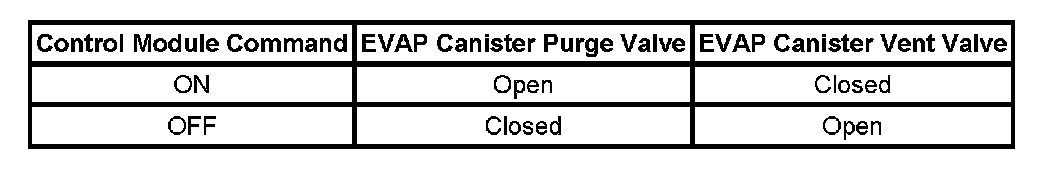 The table illustrates the relationship between the ON and OFF states, and the Open or Closed states of the EVAP canister purge and vent valves.