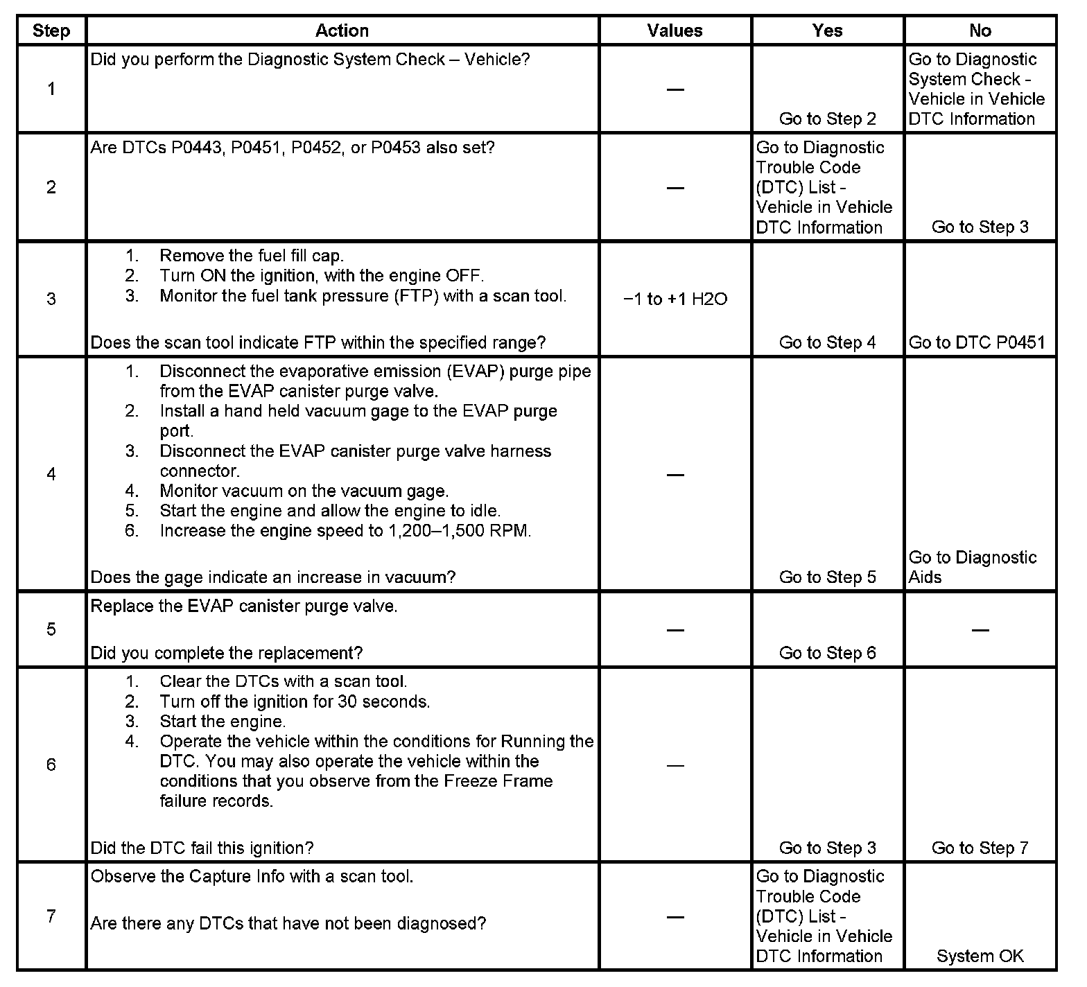 This DTC tests for undesired intake manifold vacuum flow to the evaporative emission (EVAP) system. The control module seals the EVAP system by commanding the EVAP canister purge valve Closed and the EVAP canister vent valve Closed. The control module monitors the fuel tank pressure (FTP) sensor to determine if a vacuum is being drawn on the EVAP system. If vacuum in the EVAP system is more than a predetermined value within a predetermined time, this DTC sets.