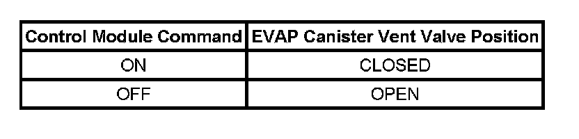 The table illustrates the relationship between the ON and OFF states, and the OPEN or CLOSED states of the EVAP canister vent valve.