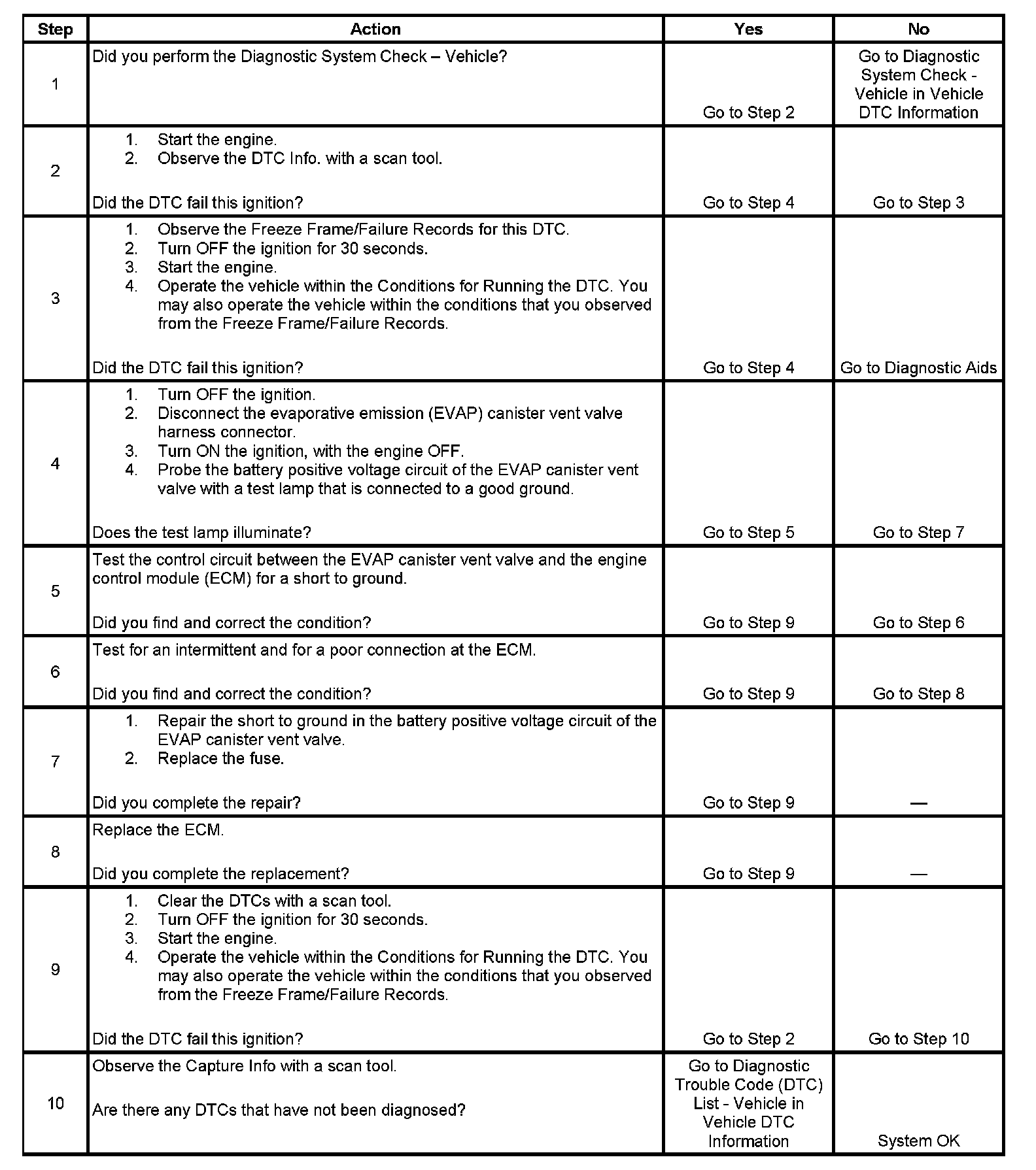 The evaporative emission (EVAP) canister vent valve is used for EVAP system diagnostics. The EVAP canister vent valve is a normally open valve. Battery positive voltage is supplied directly to the EVAP canister vent valve. The engine control module (ECM) controls the solenoid by grounding the control circuit with a solid state device called a driver. The driver is equipped with a feedback circuit that is pulled up to a voltage. The ECM can determine if the control circuit is open, shorted to ground, or shorted to a voltage by monitoring the feedback voltage. If the ECM detects the control circuit voltage is less than a predetermined value when the circuit is commanded OFF, this DTC sets.
