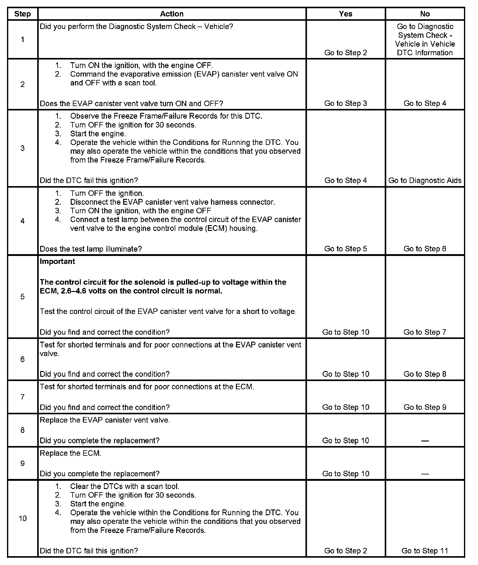 The evaporative emission (EVAP) canister vent valve is used for EVAP system diagnostics. The EVAP canister vent valve is a normally open valve. Battery positive voltage is supplied directly to the EVAP canister vent valve. The engine control module (ECM) controls the solenoid by grounding the control circuit with a solid state device called a driver. The driver is equipped with a feedback circuit that is pulled-up to a voltage. The ECM can determine if the control circuit is open, shorted to ground, or shorted to a voltage by monitoring the feedback voltage. If the ECM detects the control circuit voltage is more than a predetermined value when the circuit is commanded ON, this DTC sets.