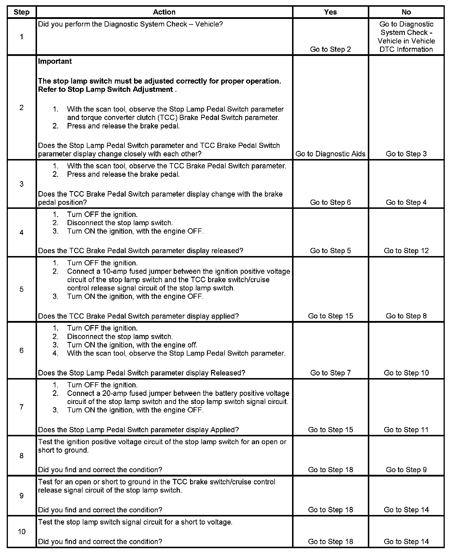 The engine control module (ECM) monitors the stop lamp switch signal circuit and the torque converter clutch (TCC) brake switch/cruise control release signal circuit every 100 ms. The ECM monitors the status of the stop lamp switch signal circuit and the TCC brake switch/cruise control signal circuit to see if they match when the brake pedal is pressed or released.