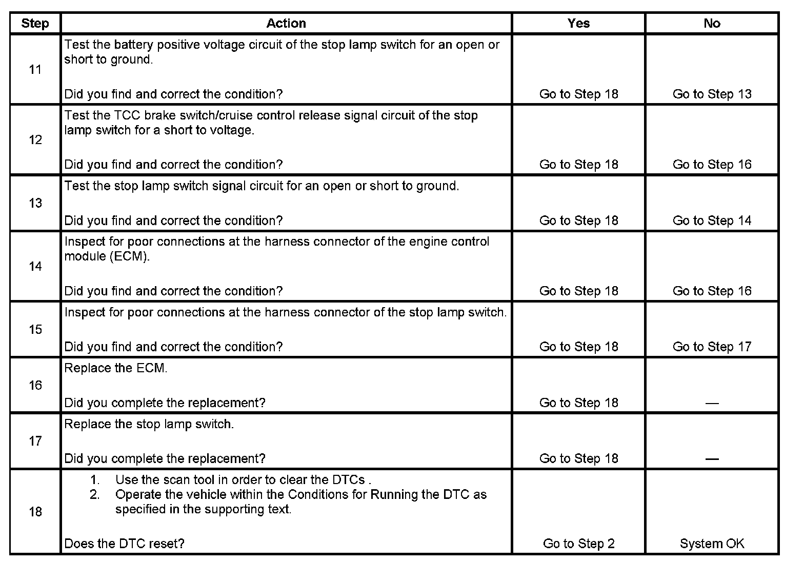 - The DTC will clear when the status of the stop lamp switch input to the ECM, and the TCC brake switch/cruise control input to the ECM match for at least 2 seconds continuously for both the pressed position and the released position.
