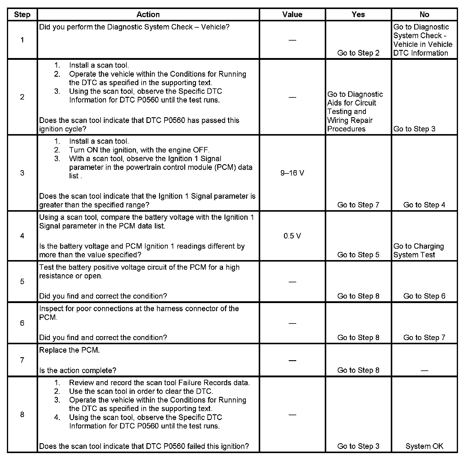 The powertrain control module (PCM) monitors the system voltage to make sure that the voltage stays within the proper range. Damage to components, and incorrect data input can occur when the voltage is out of range. The PCM monitors the system voltage over an extended length of time. If the PCM detects a system voltage outside an expected range for the calibrated length of time, DTC P0560 will set.