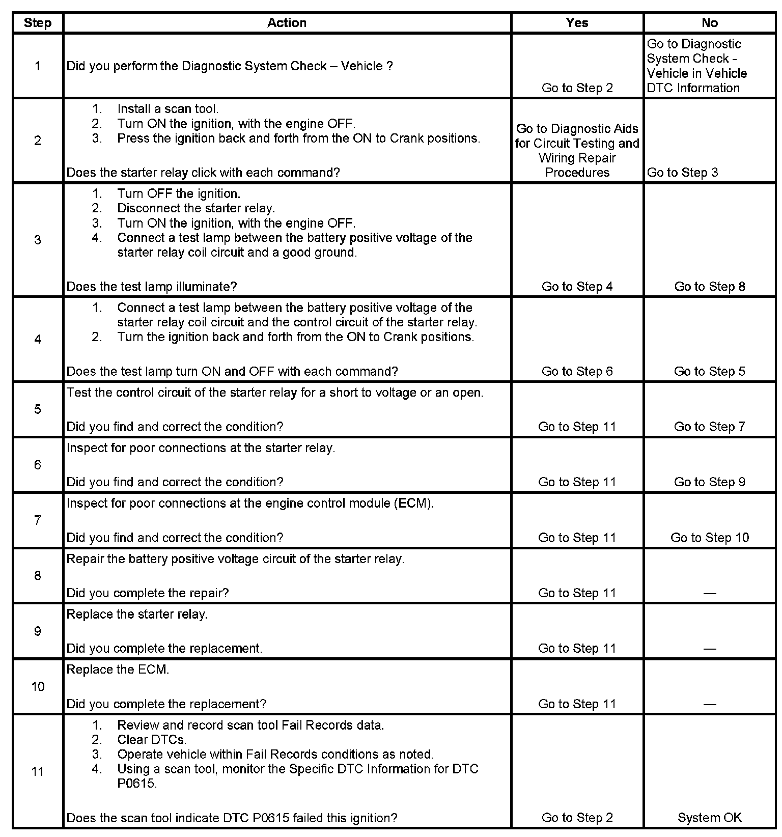 The engine control module (ECM) supplies a ground path for the STARTER relay when start enable has been requested. The ECM monitors this circuit for conditions that are incorrect for the commanded state. If the ECM detects an improper circuit condition, STARTER relay DTC P0615 will set.
