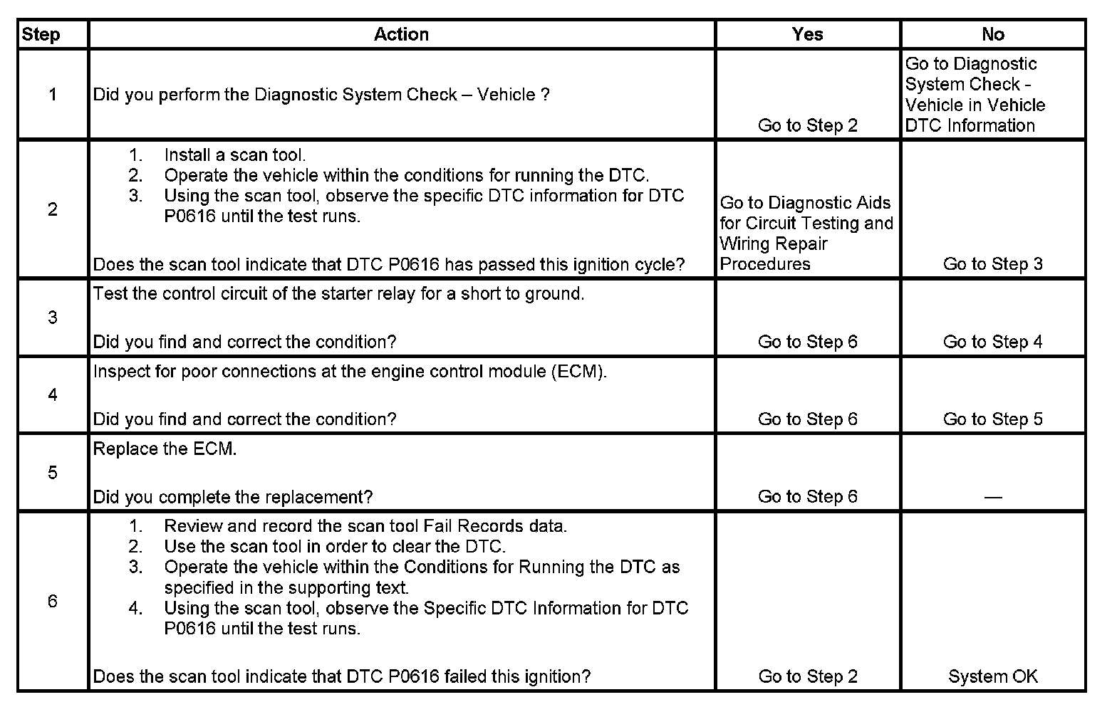 The engine control module (ECM) supplies a ground path for the starter relay when start enable has been requested. The ECM monitors this circuit for conditions that are incorrect for the commanded state. If the ECM detects an improper circuit condition, starter relay DTC P0616 will set.