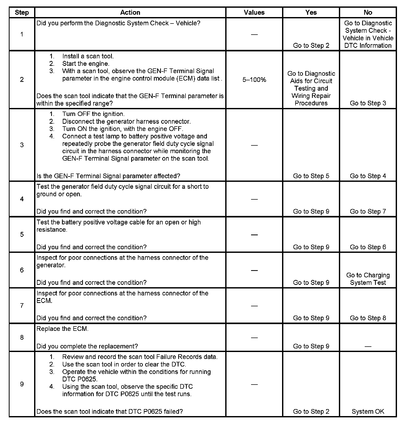 The ECM monitors the state of the generator field duty cycle signal circuit. When the engine is running, the ECM should detect a duty cycle that varies up to 100 percent. The ECM monitors the PWM signal using a key ON test and a RUN test. During the tests, if the ECM detects an out of range PWM signal, a DTC will set. When the DTC sets, the ECM will send a class 2 serial data message to the instrument panel cluster (IPC) and driver information center (DIC) to illuminate the charge indicator or display a charging message.