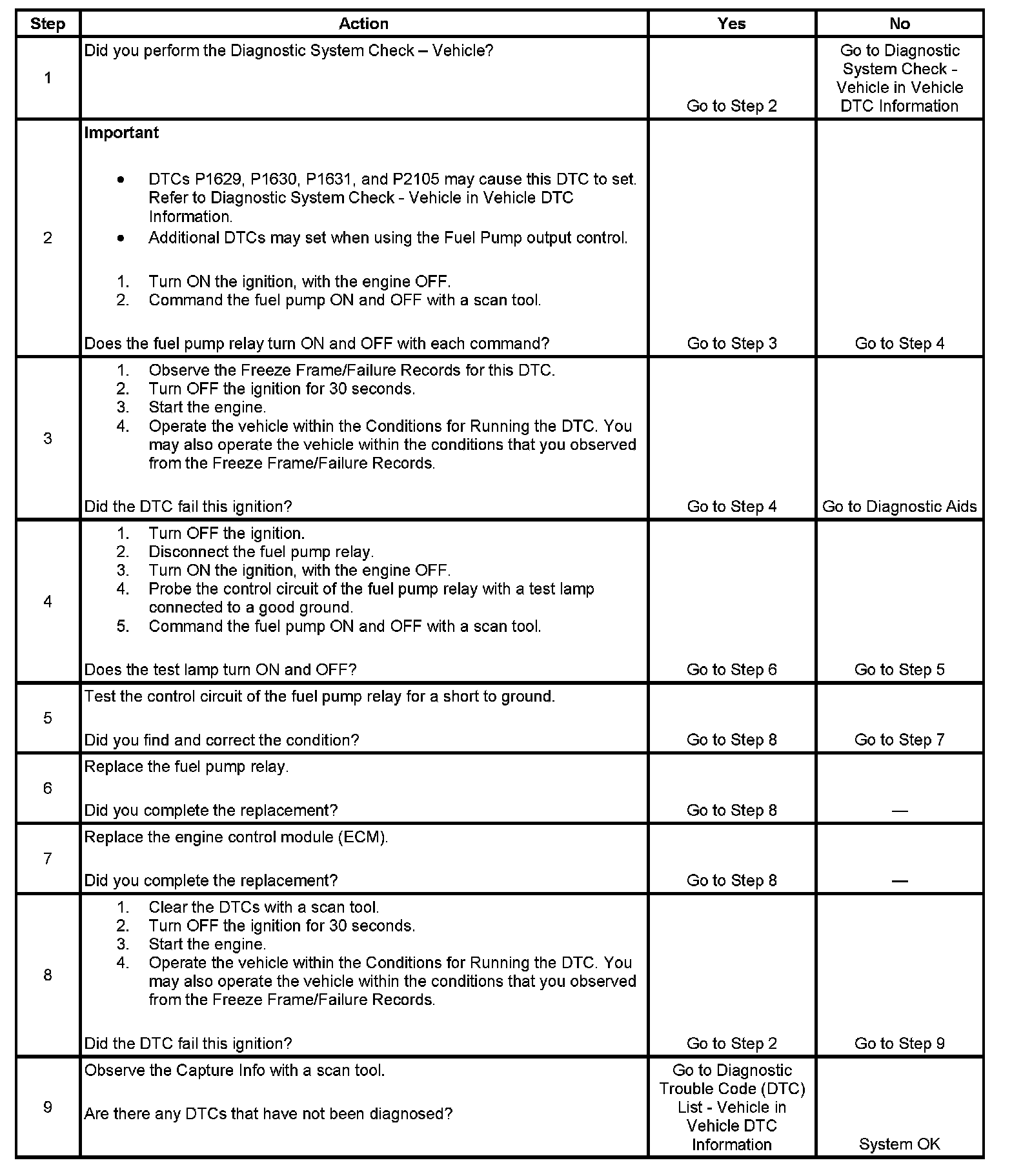 The fuel pump relay control circuit is equipped with a feedback circuit that is pulled up to 2.5 volts within the ECM. The ECM can determine if the control circuit is open, shorted to ground, or shorted to a voltage by monitoring the feedback voltage. If the ECM detects the control circuit voltage is less than a predetermined voltage when commanded ON, this DTC sets.