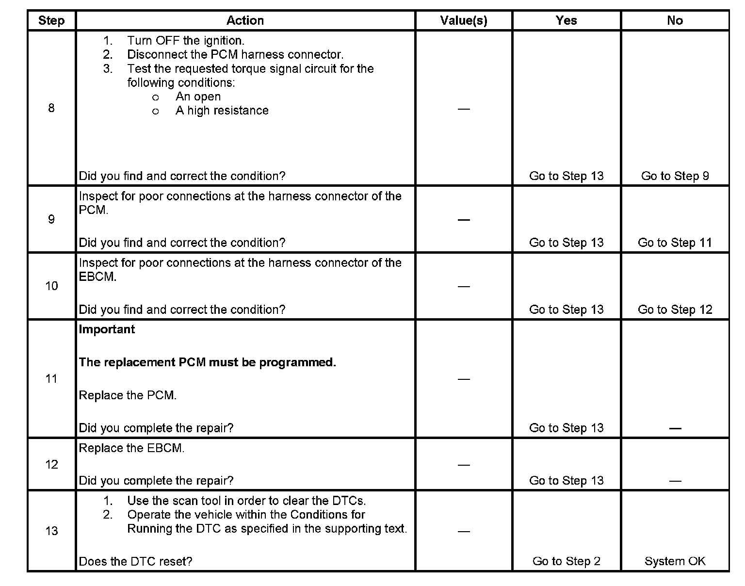 The PCM diagnoses the requested torque PWM signal circuit and sends a class 2 serial data message to the EBCM indicating a fault is present. A fault exists in the circuit if the PCM detects one of the following conditions: