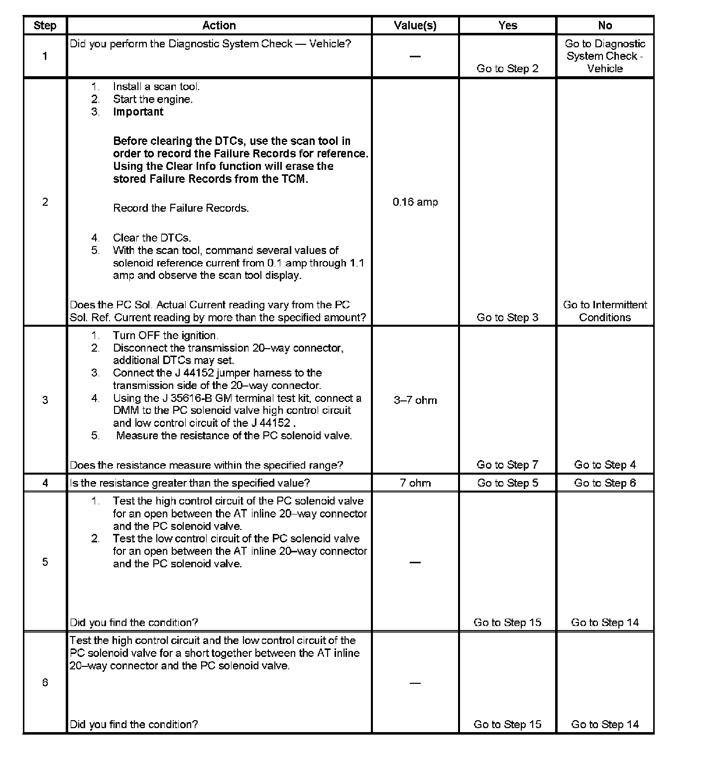^ The TCM enters PC solenoid valve diagnostic retest mode. The retest mode conducts the following diagnostic routine: