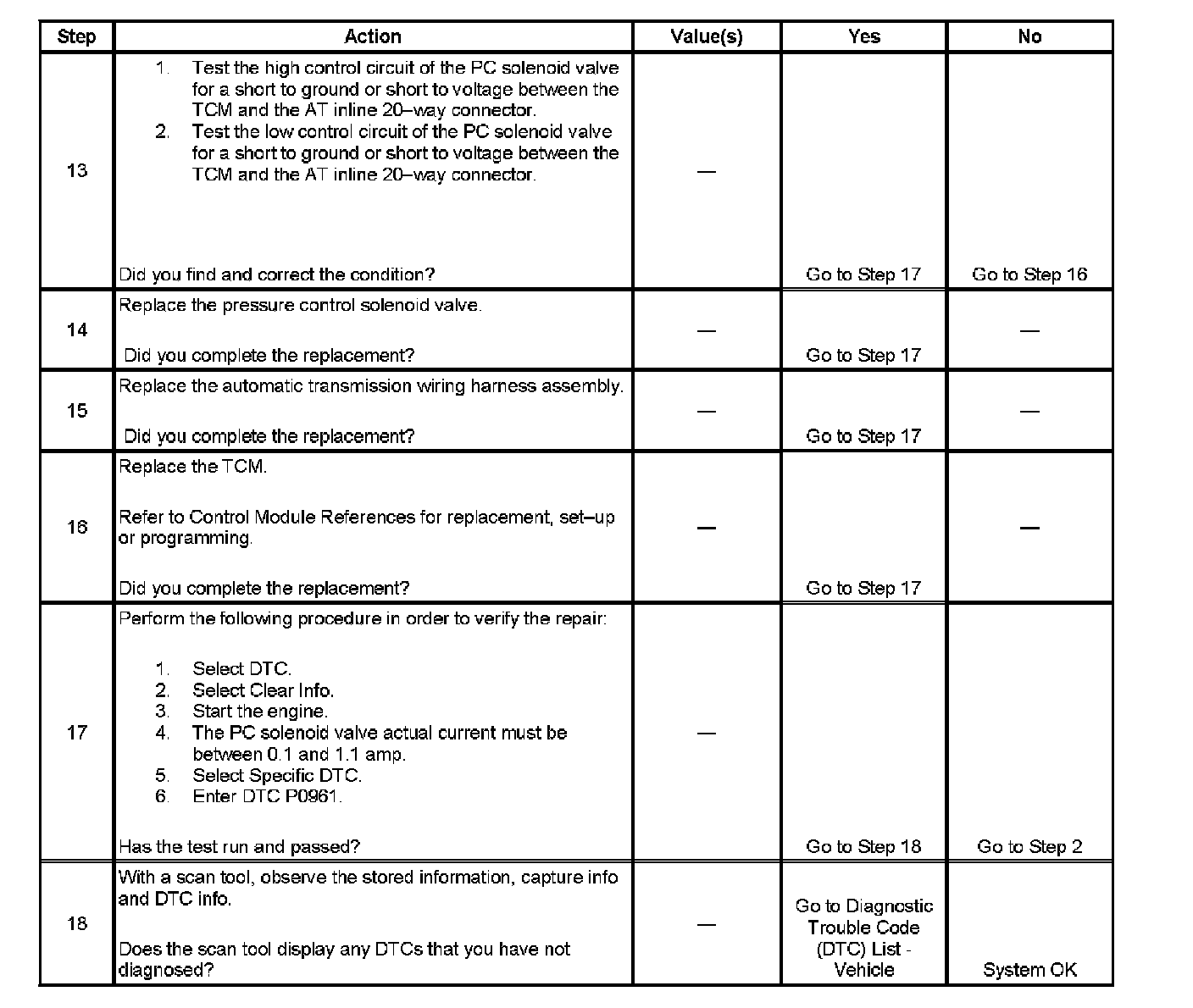 ^ If no circuit faults are detected during the 5 second retest period, then the PC solenoid valve is returned to normal operation and DTC P0961 diagnostic is passed.
