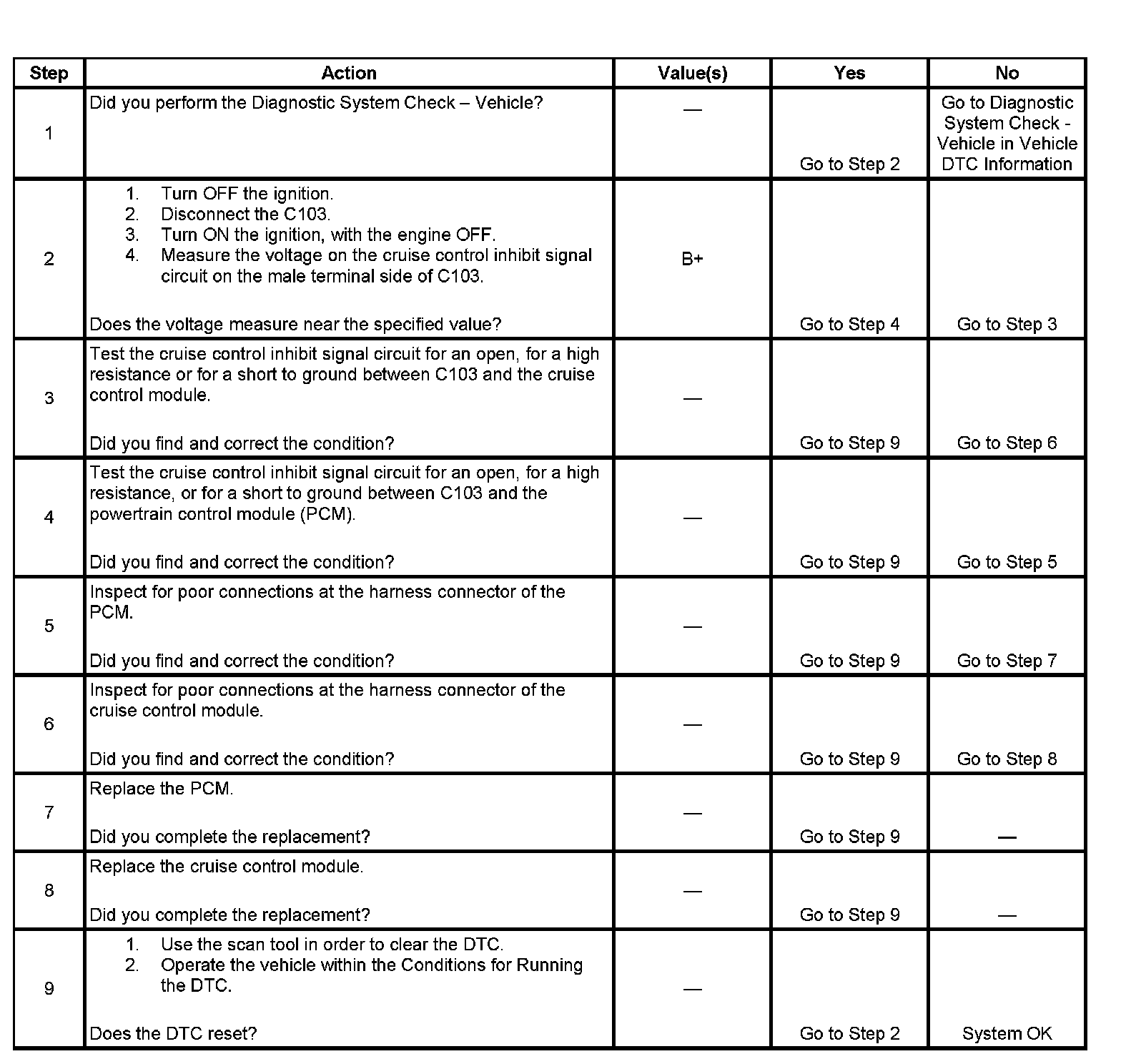 - The PCM detects that an improper voltage exists on the cruise control inhibit signal circuit.