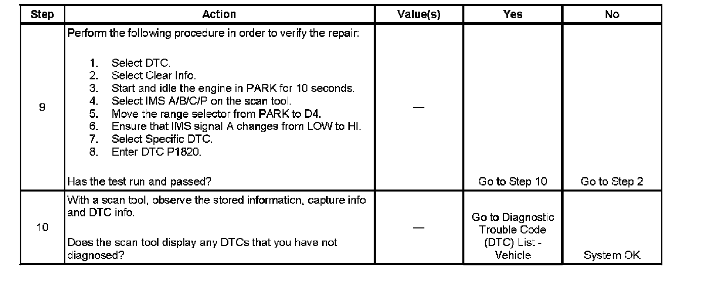 If the TCM detects that IMS Signal A is always low, then DTC P1820 sets. DTC P1820 is a type B DTC.