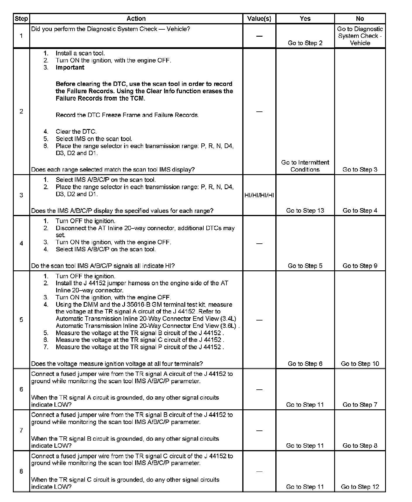 The transmission internal mode switch (IMS) is a sliding contact switch attached to the selector detent inside the transmission side cover. The four inputs to the TCM indicate the position of the transmission range selector. The input voltage level at the TCM is high, B+, when the IMS is open and low when the switch is closed to ground. The four input parameters represented are Signals A, B, C and P - Parity.