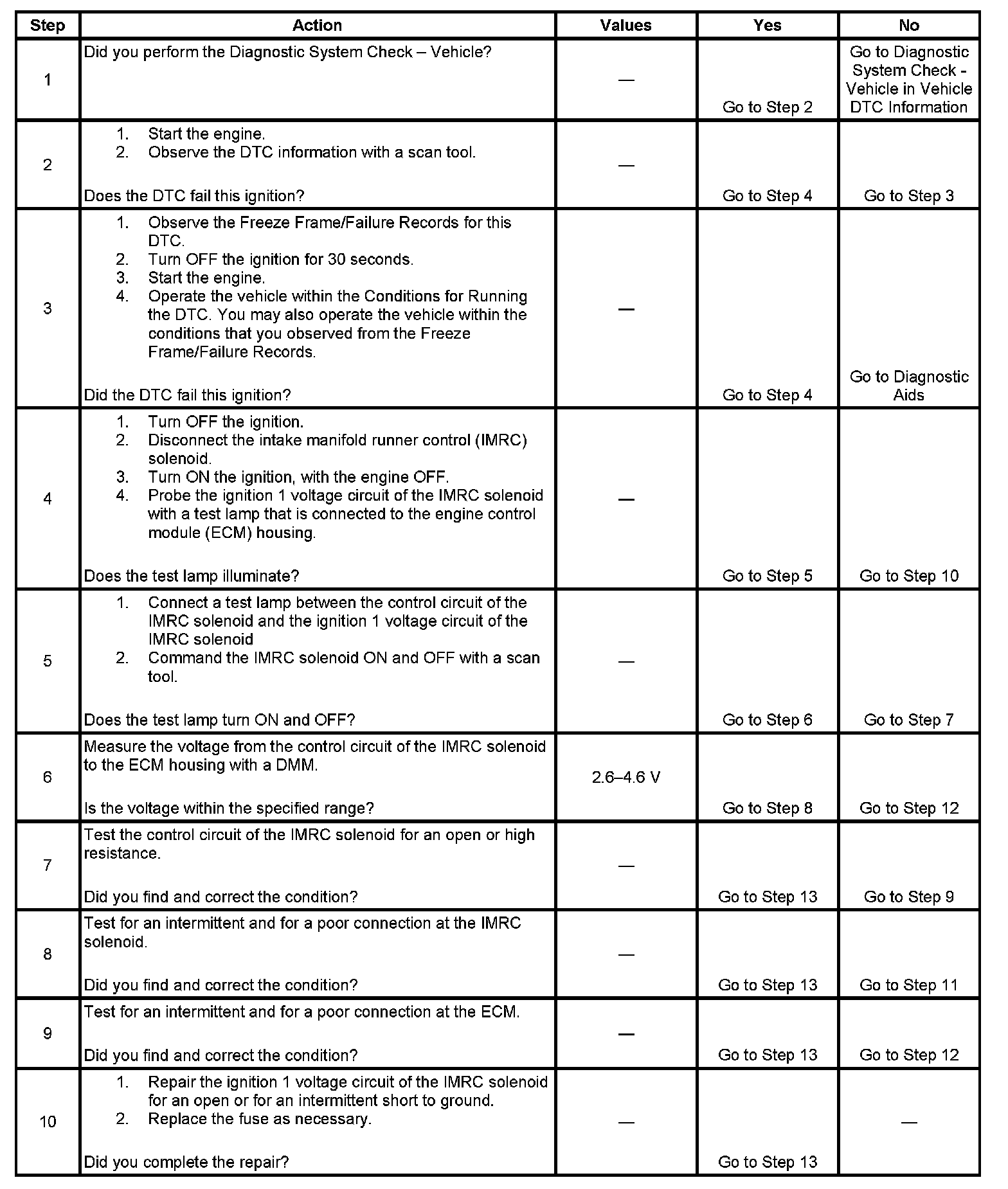 - The ECM detects the control circuit voltage for the IMRC solenoid is between 2.6-4.6 volts when the driver is commanded OFF.