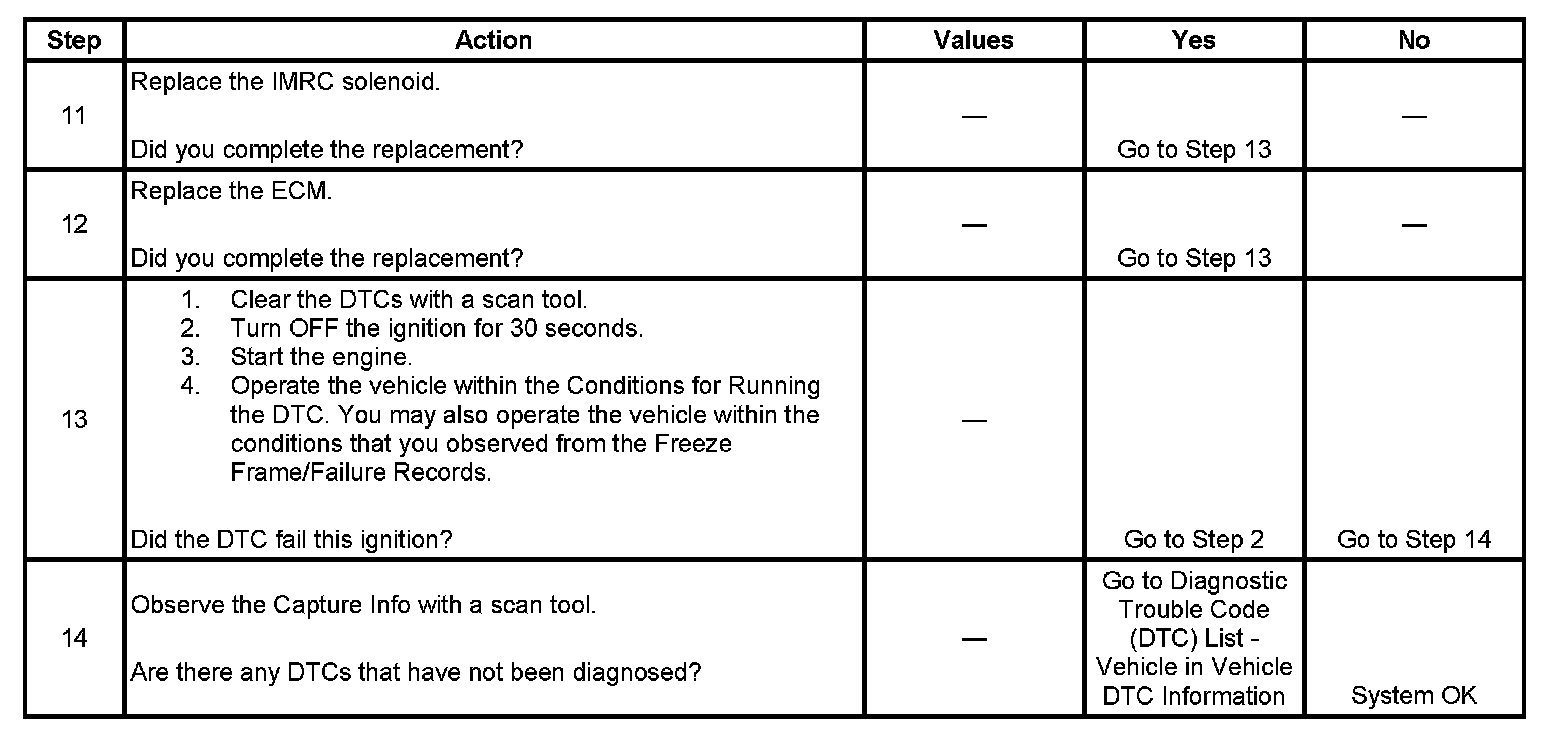 Ignition voltage is supplied directly to the IMRC solenoid. The engine control module (ECM) controls the solenoid by grounding the control circuit with a solid state device called a driver. The driver is equipped with a feedback circuit that is pulled-up to a voltage. The ECM can determine if the control circuit is open, shorted to ground, or shorted to a voltage by monitoring the feedback voltage. If the ECM detects the control circuit voltage is within a predetermined range when the circuit is commanded OFF, this DTC sets.