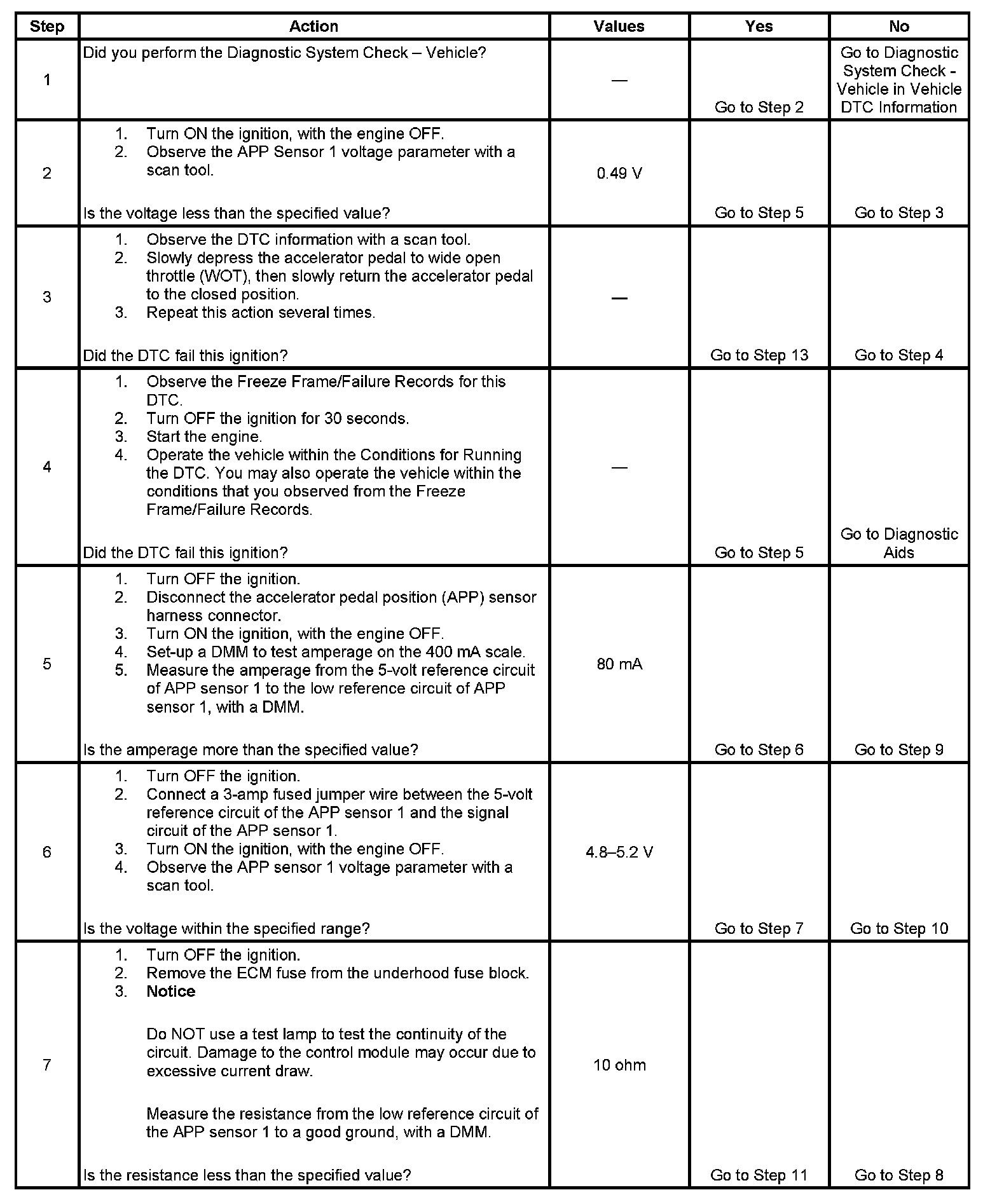 3. This step tests the internal circuits of the APP sensor 1 throughout its range off motion. If this DTC sets when slowly moving the pedal from the rest position to wide open throttle (WOT), replace the APP assembly for an internal fault.