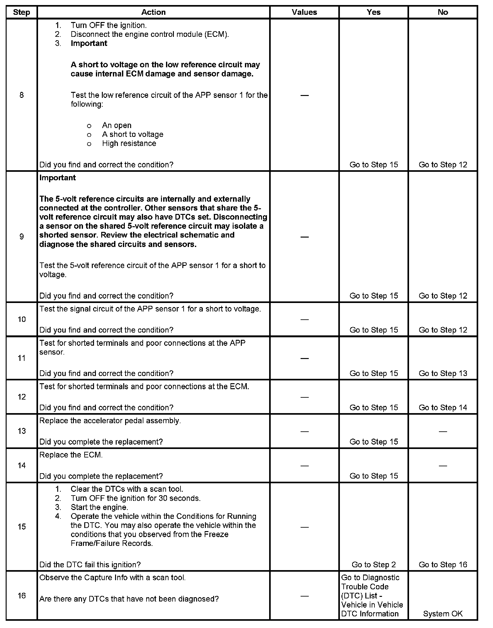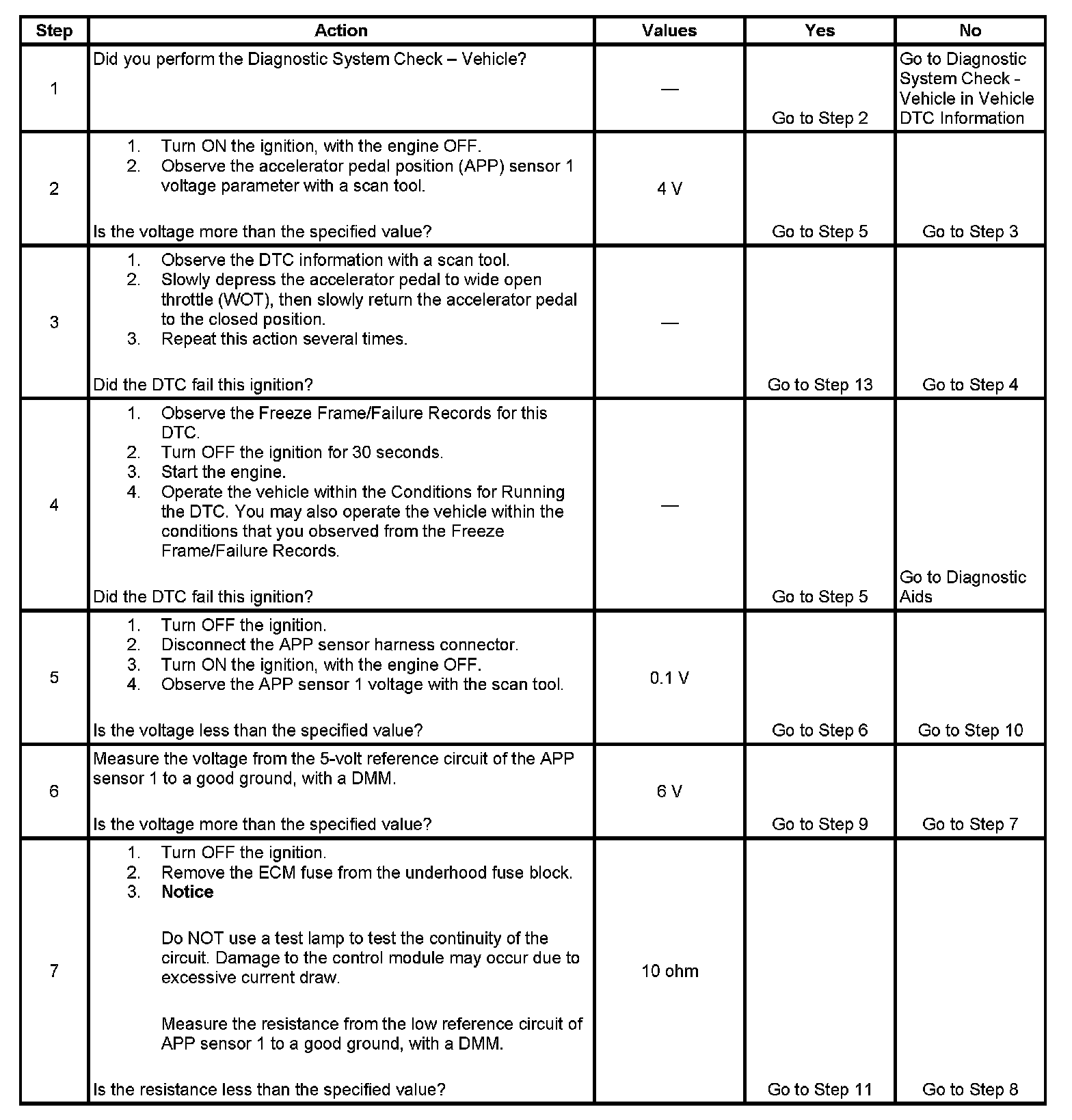 3. This step tests the internal circuits of the APP sensor 1 throughout its range of motion. If this DTC sets when slowly moving the pedal from the rest position to wide open throttle (WOT), replace the APP assembly for an internal fault.