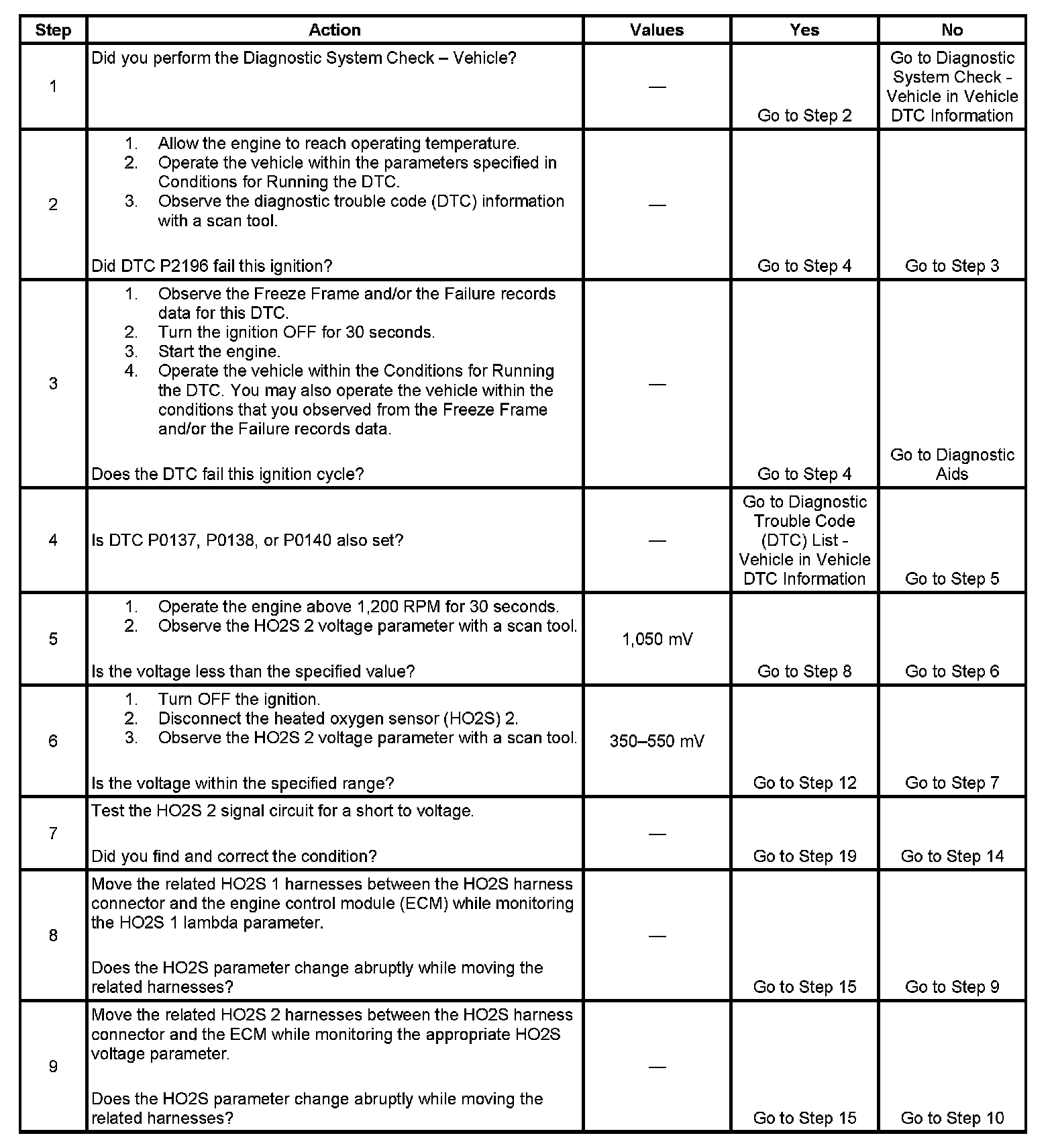 - Before the ECM can report DTC P2196 failed, DTCs P0030, P0031, P0032, P0036, P0037, P0038, P0053, P0101, P0130, P0131, P0132, P0133, P0135, P0137, P0138, P0140, P0141, P167A, P2231, P2237, P2243, P2251, P2270, P2271, P2297 and P2626 must run and pass.