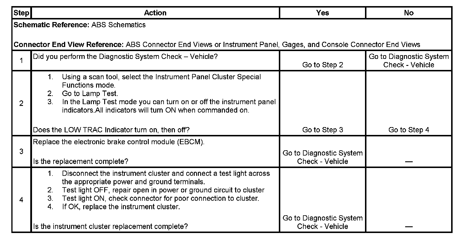 The instrument panel cluster (IPC) turns the LOW TRAC indicator on, during the IPC bulb check, for approximately 3 seconds when the ignition switch is turned to the ON position. If the electronic brake control module (EBCM) sets a diagnostic trouble code (DTC), the EBCM sends the IPC the command to turn the LOW TRAC indicator ON.
