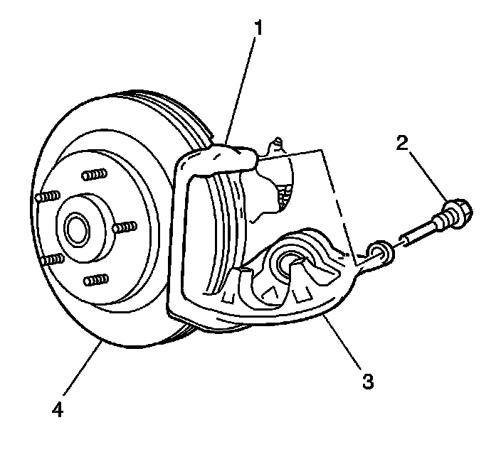 2. Slowly tighten the C-clamp (3) until the piston pushes into the caliper bore enough to slide the caliper (2) off the rotor.