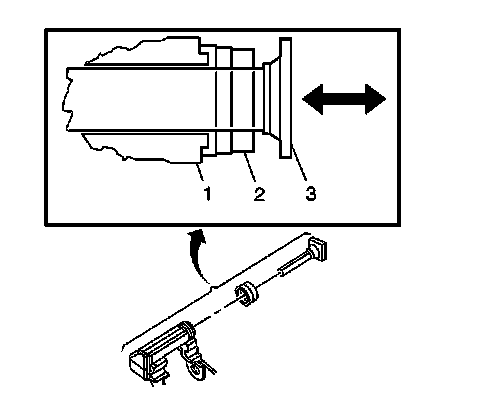 4. Inspect the caliper slide pins (3) by gently pulling outward, without disengaging the slides from the boots, then pushing inward, and observe for the following:
