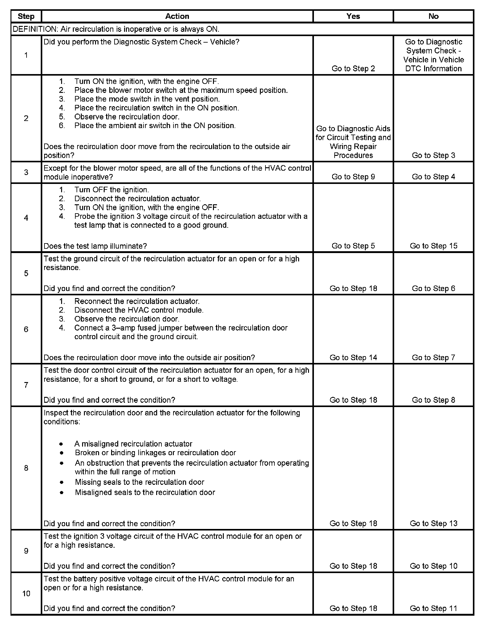 The number below refers to the step number on the diagnostic table.
